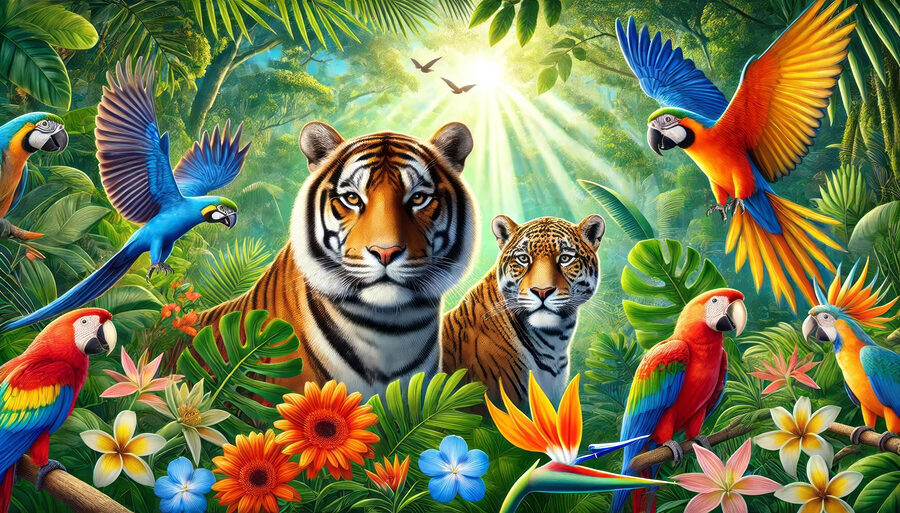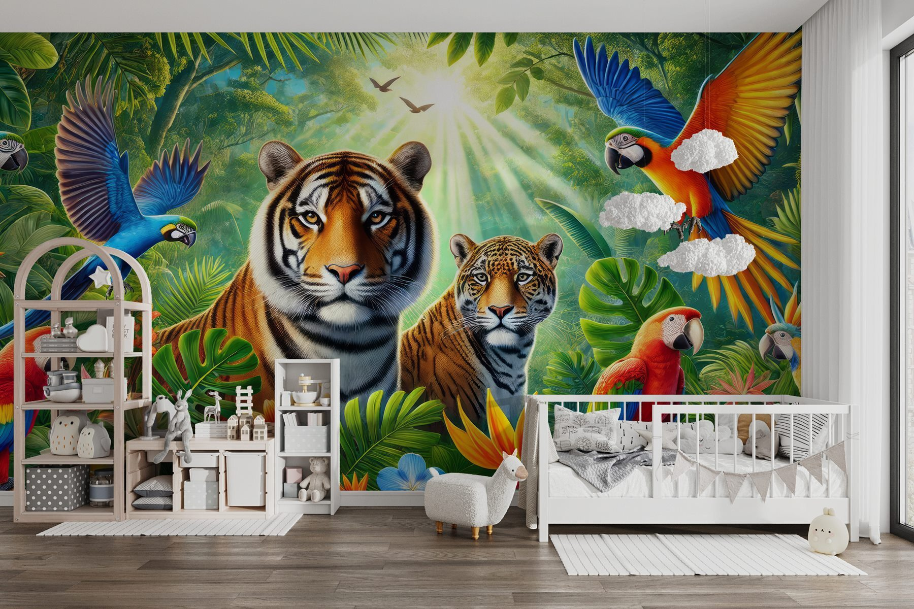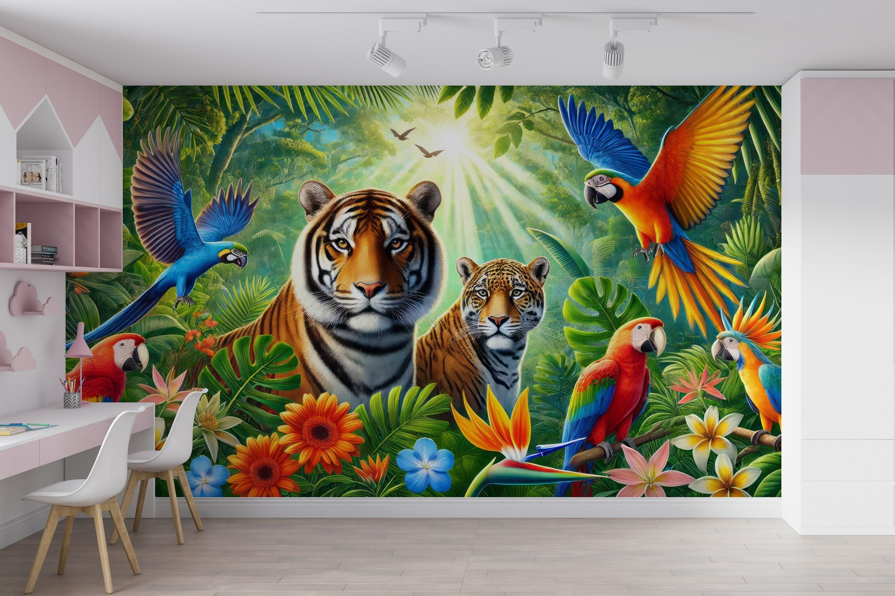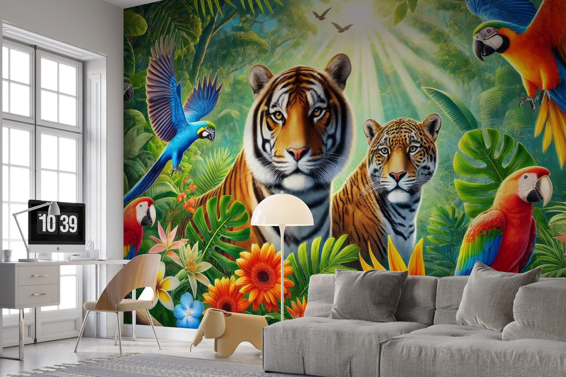 Plongez dans une jungle merveilleuse avec cette superbe peinture murale ! Imaginez que vous rentriez chez vous et que vous découvriez une scène pleine de vie – des tigres se détendent et des perroquets colorés se donnent en spectacle. C’est comme si vous viviez une aventure dans votre salon. Vous pouvez presque entendre le bruissement des feuilles et les cris joyeux. Placez cette peinture murale sur votre mur, et soudain votre espace ressemblera à une retraite luxuriante, prête pour des vacances tropicales à tout moment. Parfait pour ceux qui aiment la nature ou qui ont simplement besoin d’une étincelle lumineuse dans leur maison. Sérieusement, qui ne sourirait pas à chaque fois qu’il passe devant ? C’est un régal pour les yeux !