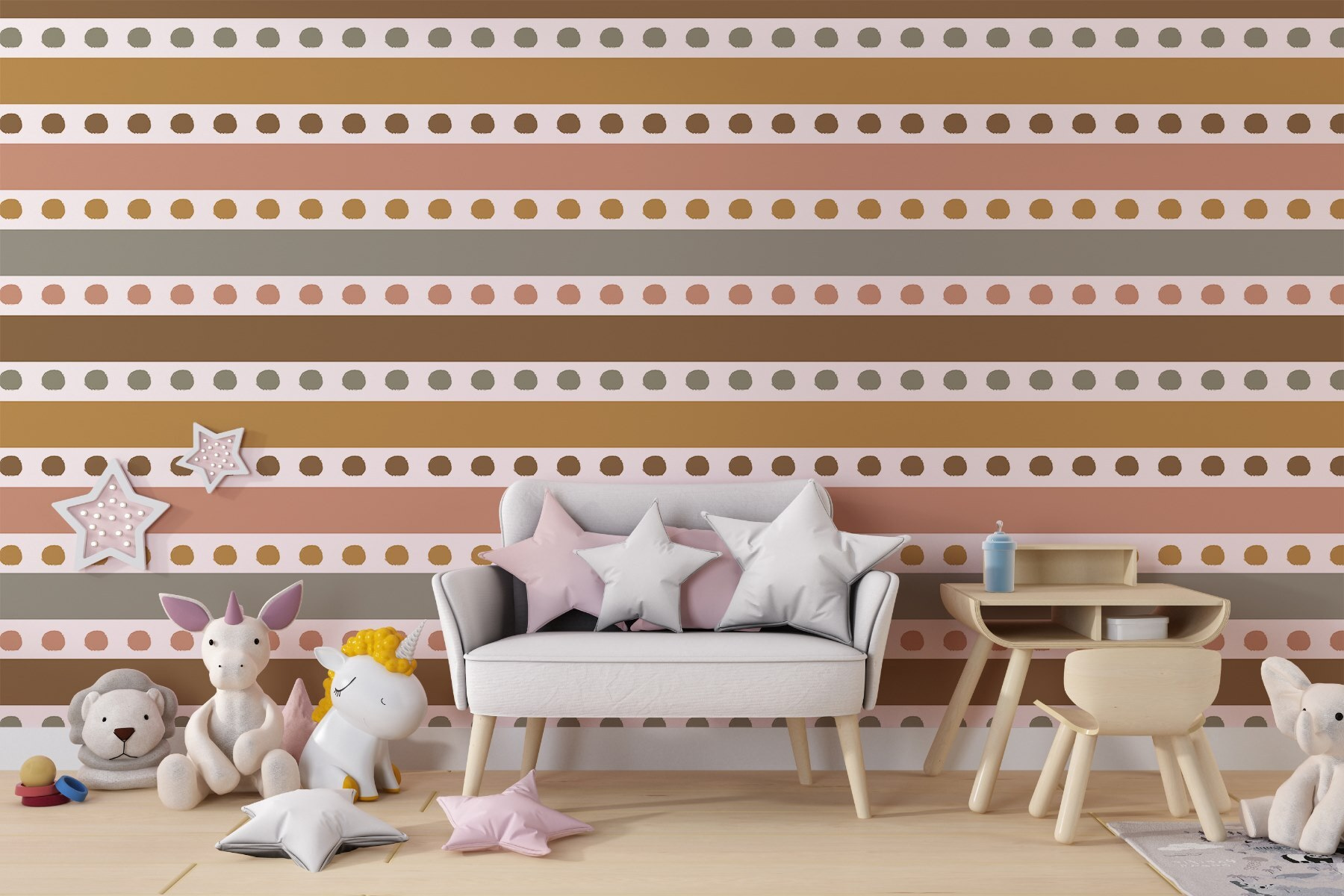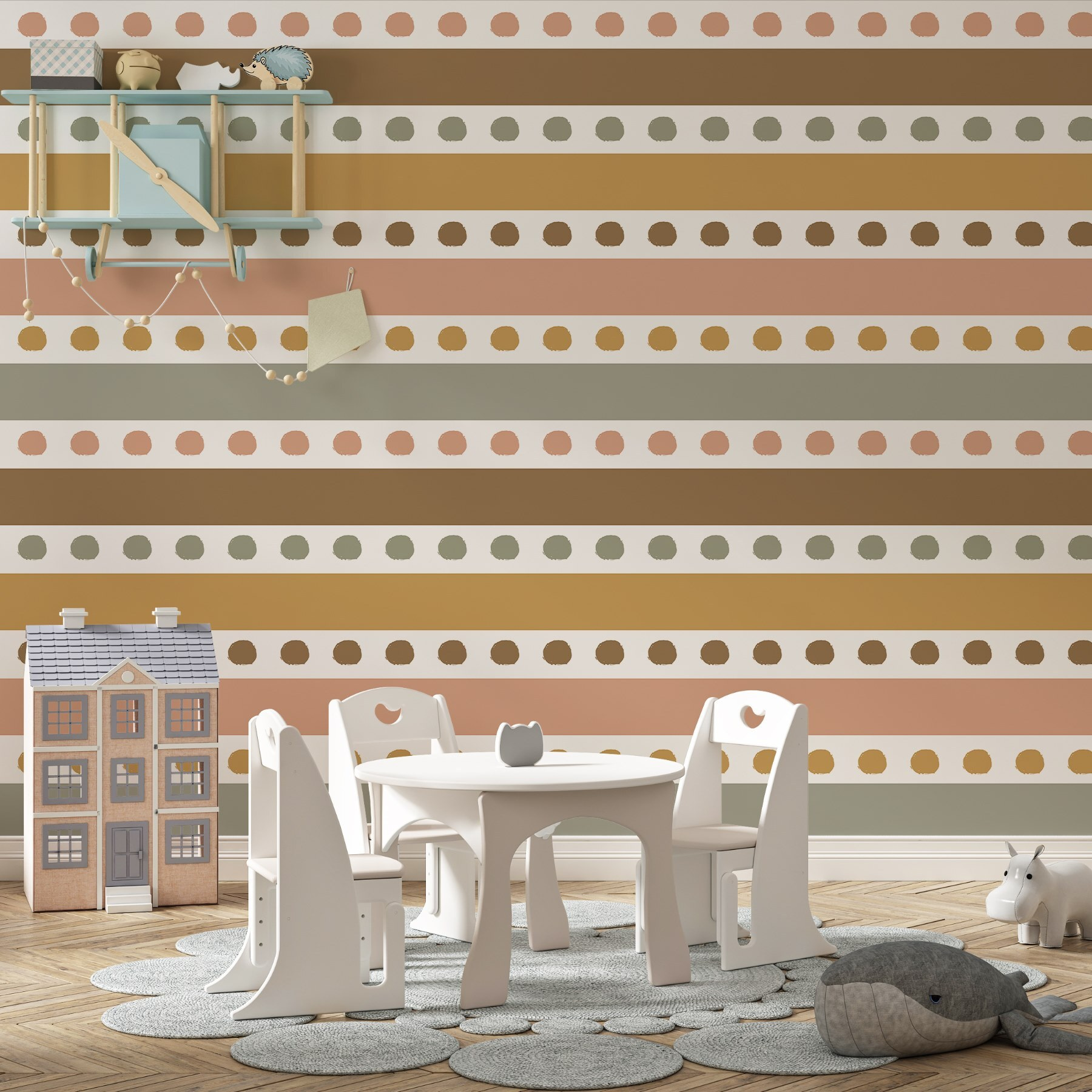 Illuminez votre espace avec le “motif mural de points colorés” ! Ce motif ludique présente une symphonie de points dans des teintes douces et terreuses. Imaginez une atmosphère douillette et accueillante, parfaite pour des réunions détendues ou des retraites en solitaire avec un livre. Chaque rayure apporte une touche de légèreté qui rappelle un pique-nique ensoleillé. Imaginez quelqu’un qui entre, sourit aux points joyeux et se sent soudain inspiré pour organiser un goûter ou simplement pour savourer une part de gâteau sur le canapé. C’est comme un câlin chaleureux pour vos murs, qui donne vie à n’importe quelle pièce sans effort. Vous aurez du mal à ne pas admirer ces points tous les jours !