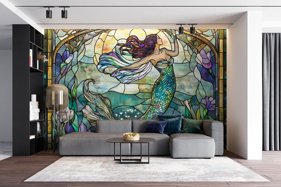 Plongez dans un monde sous-marin coloré grâce à cette peinture murale représentant une sirène sur un vitrail. Imaginez que vous sirotiez votre café du matin tout en vous imprégnant des joyeuses teintes de bleu et de vert de l’océan qui se répandent sur vos murs. Les délicats tourbillons et les lignes fluides créent un sentiment de tranquillité qui adoucit n’importe quel espace. Imaginez des soirées cinéma douillettes entre amis, où tout le monde est attiré par le charme magique de la sirène. Cette peinture murale ne se contente pas de décorer une pièce, elle invite à raconter des histoires, à rêver et à faire preuve d’un peu de fantaisie dans la vie de tous les jours. Parfait pour les amoureux de la nature ou pour tous ceux qui veulent une touche de mer dans leur maison.