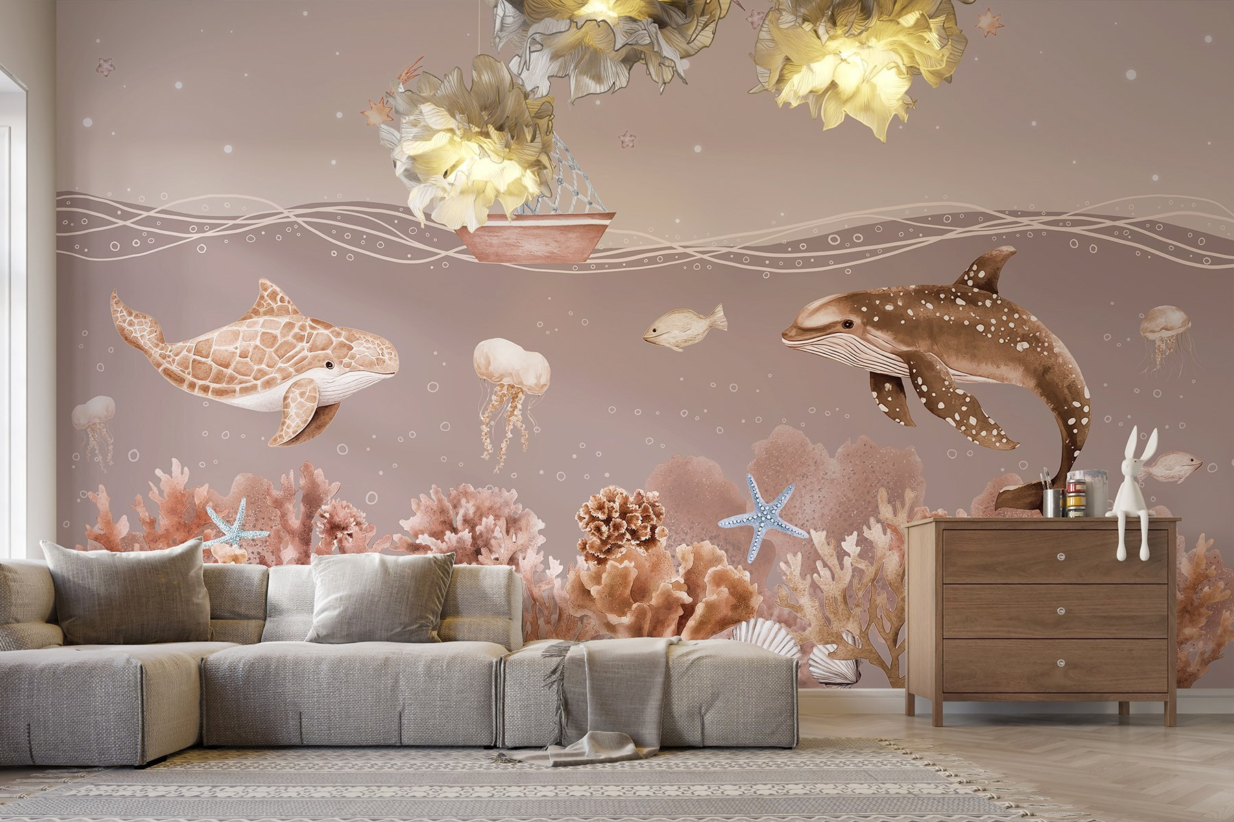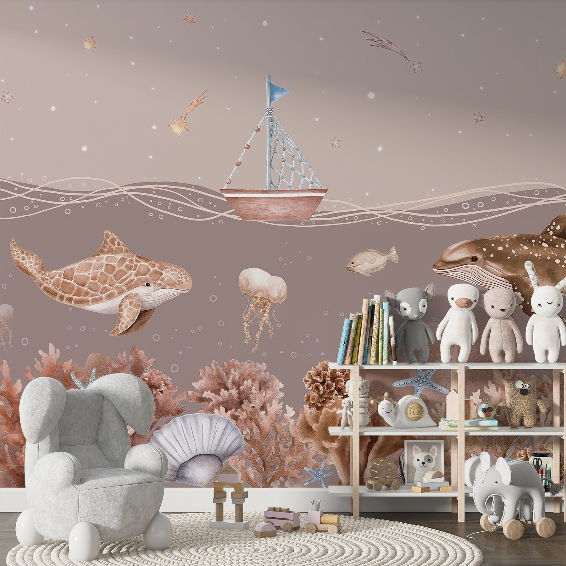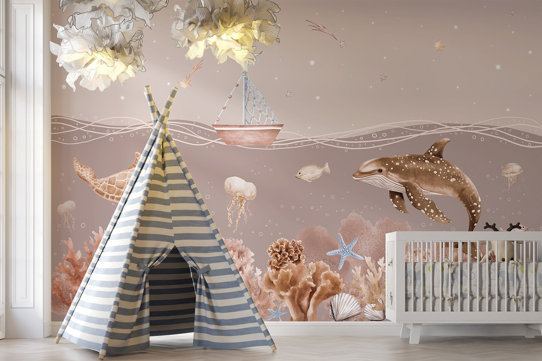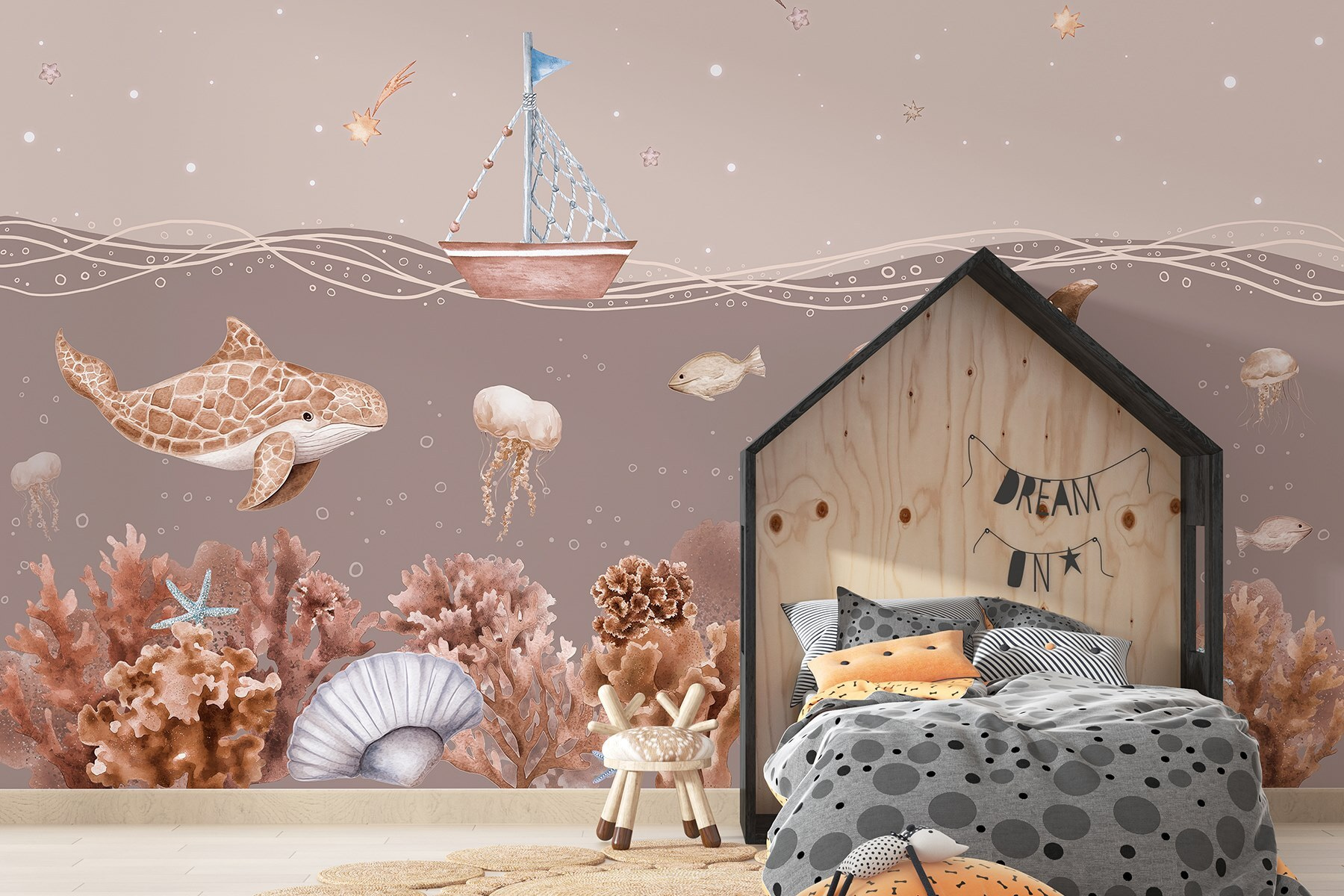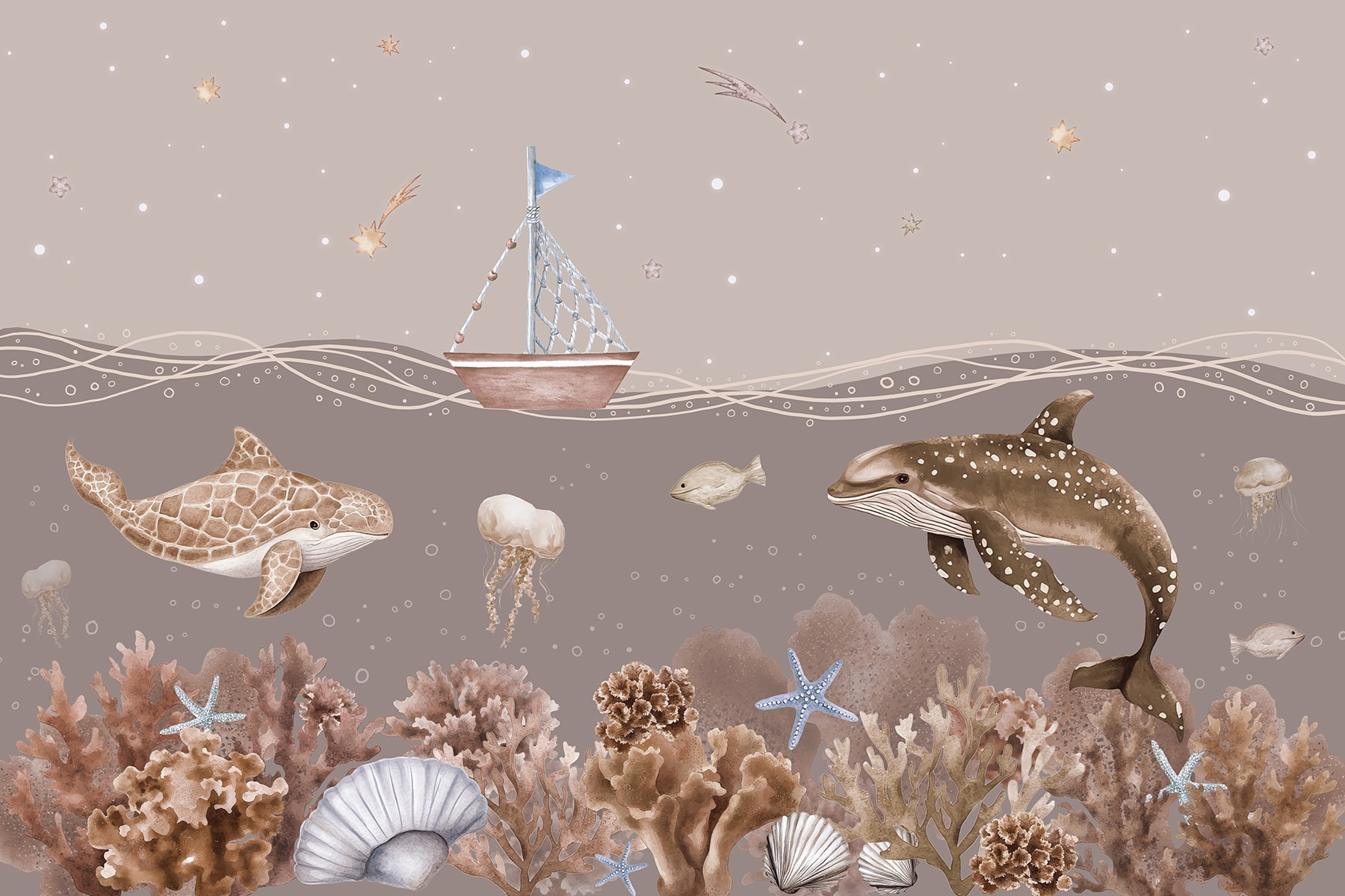 Plongez dans un monde de fantaisie avec cette superbe peinture murale, “Sea Life with a Boat and Fish” (Vie marine avec un bateau et des poissons). Imaginez : un doux voilier flottant au-dessus d’une faune et d’une flore marines enjouées, presque réalistes. C’est comme une aventure sous-marine secrète dans votre salon ! Imaginez les enfants (ou les adultes !) rêvant d’histoires sous-marines en regardant la tortue, la méduse et le corail vibrant. Cette peinture murale apporte une ambiance calme et marine à n’importe quel espace et ajoute une touche de joie. Il est parfait pour les maisons, les crèches ou tout autre endroit où une touche de magie océanique est nécessaire. Qui ne sourirait pas devant cette scène joyeuse ?