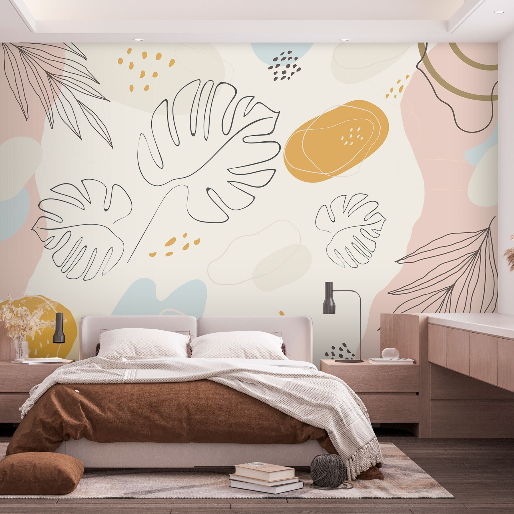 Transformez votre espace avec la peinture murale “Feuilles artistiques sur fond pastel”. C’est comme si vous faisiez entrer une douce brise des tropiques dans votre salon. Ces tons gais et doux de rose, jaune et bleu créent une ambiance sereine, idéale pour siroter un thé et rêvasser. Imaginez à quel point vous vous sentiriez à l’aise lors d’un après-midi pluvieux, juste vous et votre livre préféré. De plus, les motifs ludiques des feuilles invitent un peu de nature à l’intérieur, sans arrosoir ni routine d’entretien. Idéal pour n’importe quelle pièce, il évoque le charme et la créativité. Vos murs seront superbes, et croyez-moi, vos invités seront peut-être un peu jaloux !