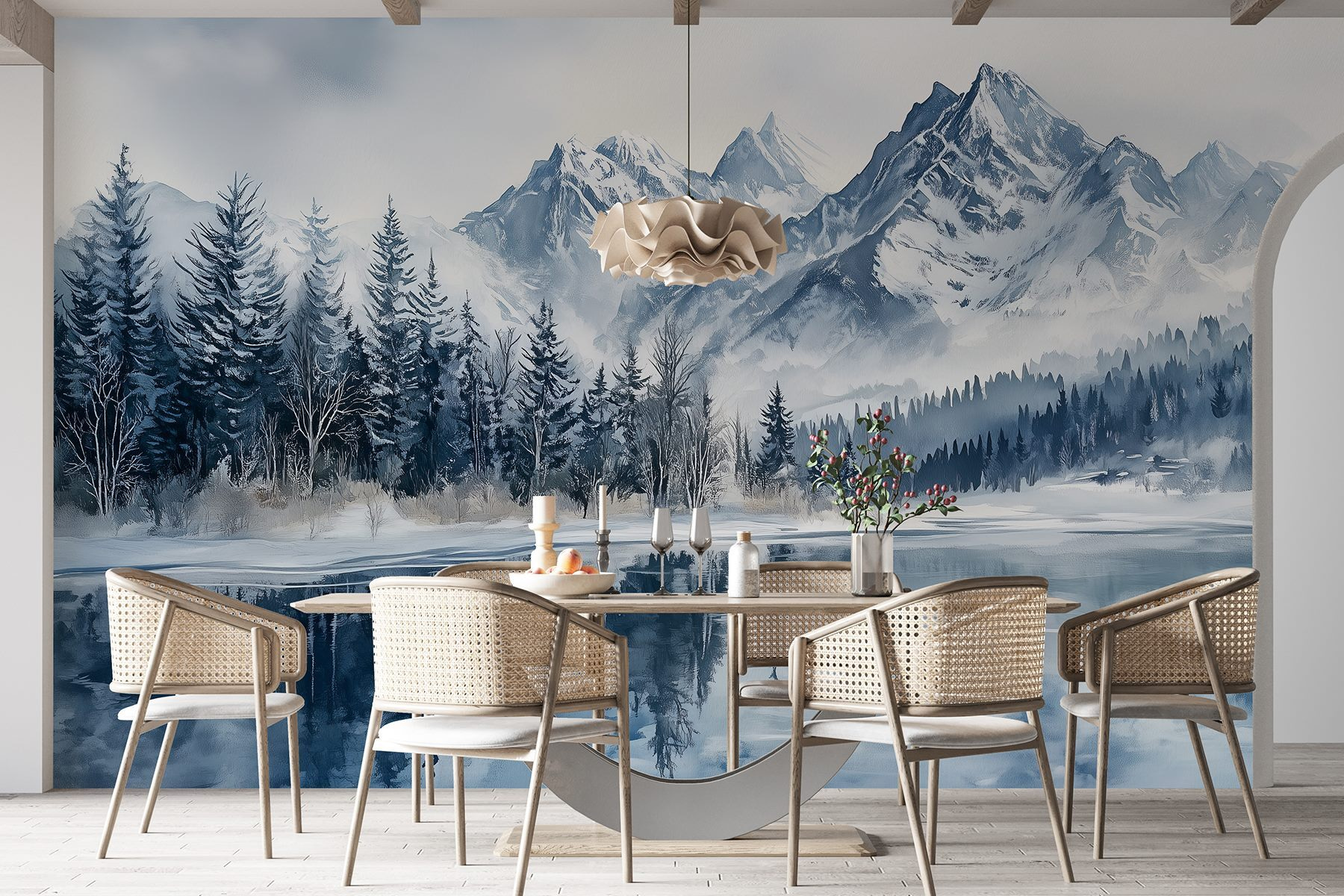 Transformez votre espace en un pays des merveilles hivernales avec cette superbe peinture murale d’un lac serein entouré de montagnes et d’arbres enneigés. L’effet aquarelle doux invite à une ambiance calme, parfaite pour se réchauffer avec une tasse de thé ou pour faire semblant d’être un garde forestier de montagne pour une journée. Imaginez que vous regardez la lumière du soleil danser sur l’eau tandis que ces sommets vous tiennent compagnie. C’est un petit coin de nature dans votre salon. De plus, la neige a quelque chose de frais et de paisible. Qui n’en voudrait pas ? Faites de vos murs une toile de rêve et laissez-vous emporter par la beauté de l’hiver, tout au long de l’année !