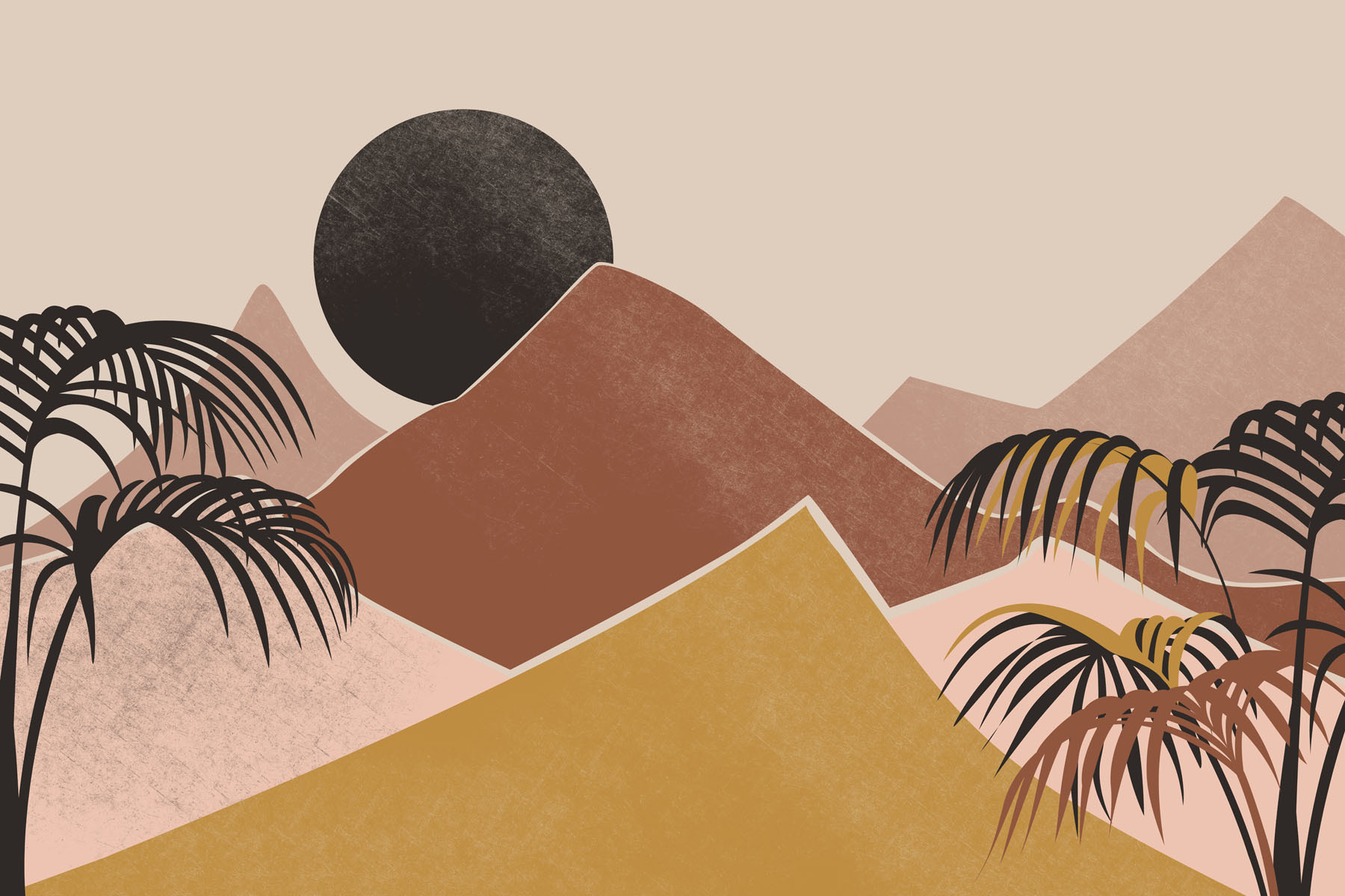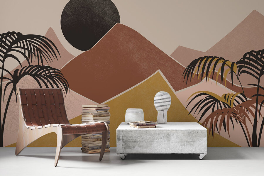 Transformez n’importe quelle pièce avec cette superbe peinture murale, “Paysage avec palmiers et montagnes”. Imaginez que vous pénétrez dans un lieu d’évasion confortable à chaque fois que vous le regardez. Les tons chauds et terreux combinés aux silhouettes des palmiers qui se balancent en font une toile de fond parfaite pour des rêveries de lieux lointains. Cette fresque murmure des “vibrations de vacances” et fait des merveilles dans un salon, une chambre à coucher ou même un coin créatif. C’est comme une douce étreinte de la nature, juste à la maison. De plus, ces montagnes promettent des aventures sans jamais quitter le canapé – qui pourrait y résister ?