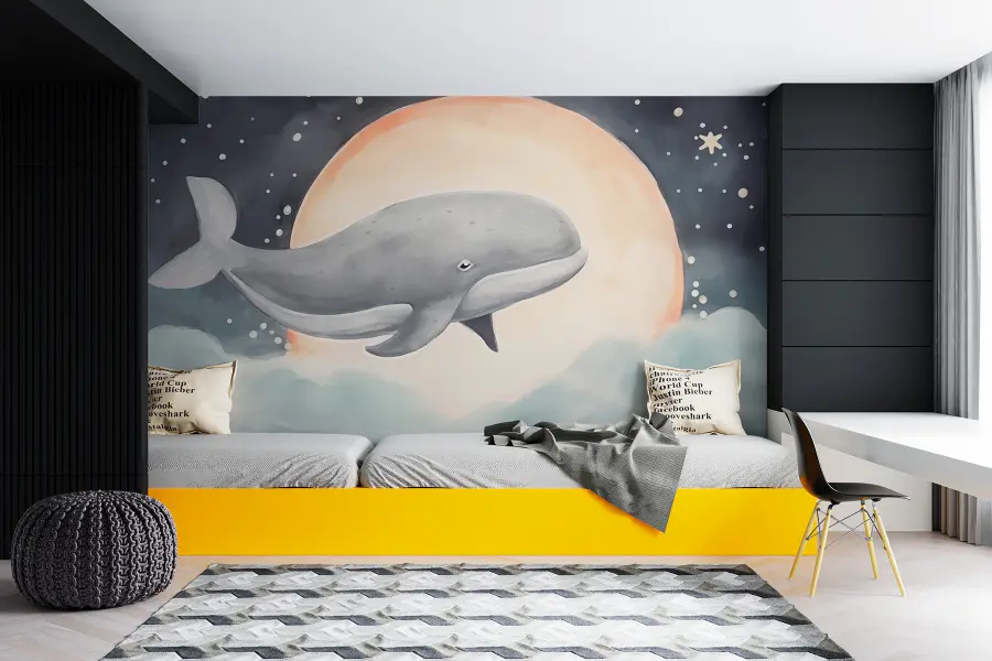 Voici la peinture murale “Baleine dans le ciel”, où la magie de l’océan rencontre les nuages de rêve. Imaginez cette baleine majestueuse glissant tranquillement dans une nuit étoilée, diffusant une ambiance sereine dans n’importe quel espace. C’est comme si vous faisiez entrer un morceau d’océan dans votre maison, sans l’eau salée, bien sûr. Parfait pour un thème côtier ou même une chambre d’enfant fantaisiste, il suscite la curiosité et l’émerveillement. Imaginez des soirées douillettes passées à contempler ce doux géant – qui ne se sentirait pas un peu plus détendu ? Avec ses douces teintes d’aquarelle et son atmosphère accueillante, cette peinture murale fait de n’importe quel mur un sujet de conversation. Plongez dans un décor qui ressemble à une étreinte de la mer !