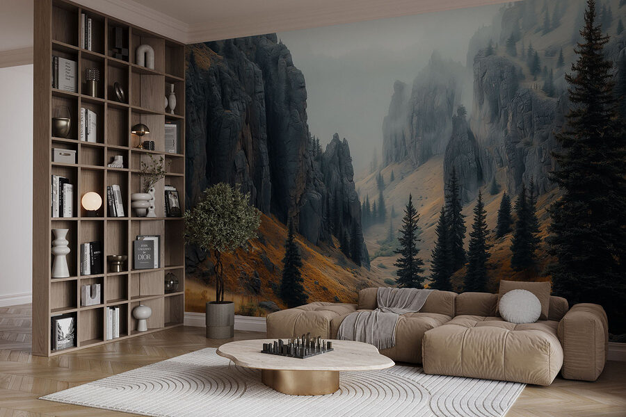 Papier peint Montagnes rocheuses avec arbres et brouillard (UGS: w02682)