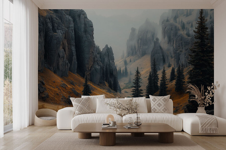 Papier peint Montagnes rocheuses avec arbres et brouillard Papier peint Montagnes rocheuses avec arbres et brouillard