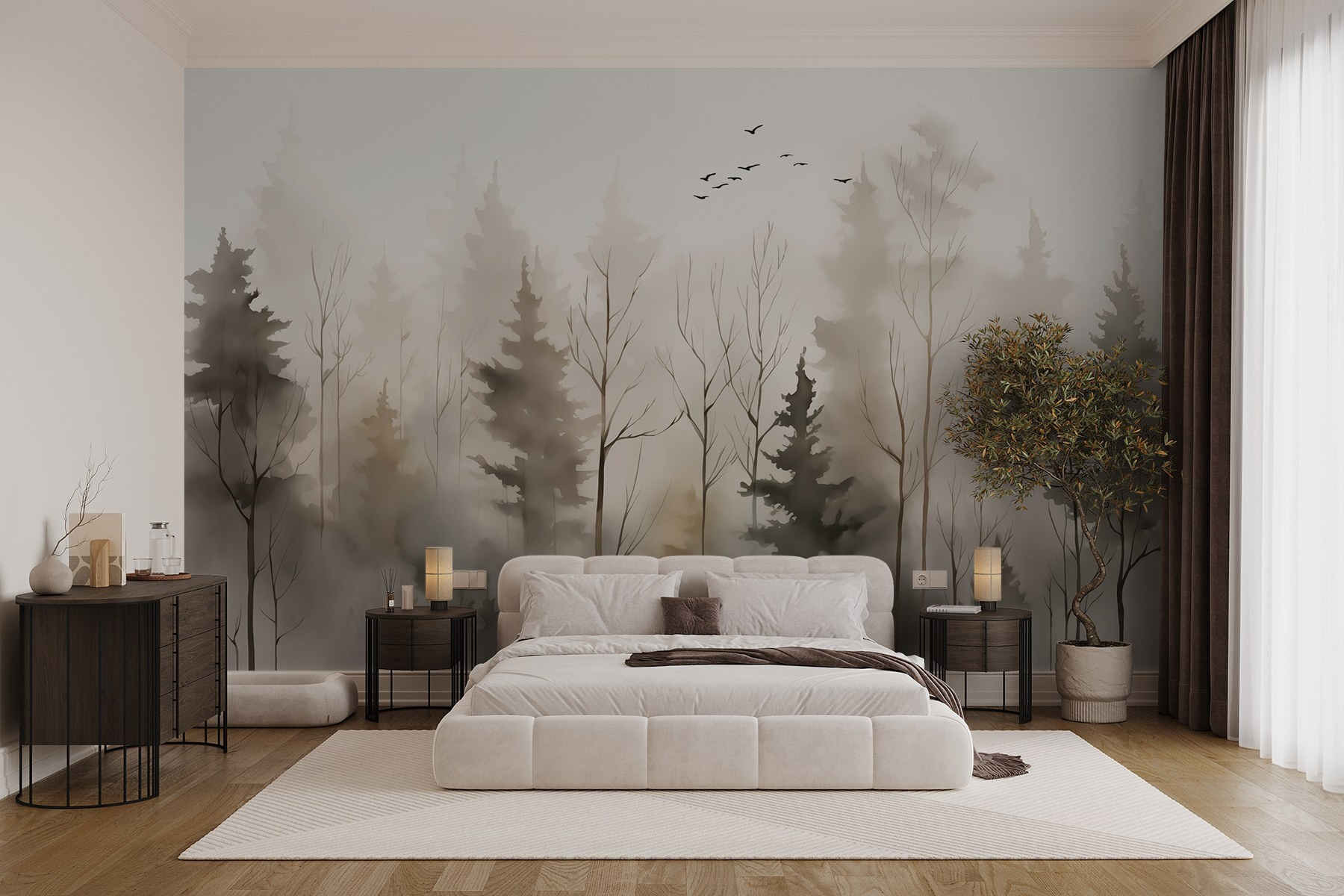 Transformez n’importe quel espace en une échappée sereine dans les bois avec la peinture murale “Groupe d’arbres dans le brouillard”. Imaginez-vous en train de vous installer dans votre salon, les tons doux et feutrés vous incitant à vous détendre après une longue journée. Cette fresque murmure le calme, enveloppant vos murs de la beauté délicate de la nature – sans les moustiques, bien sûr !