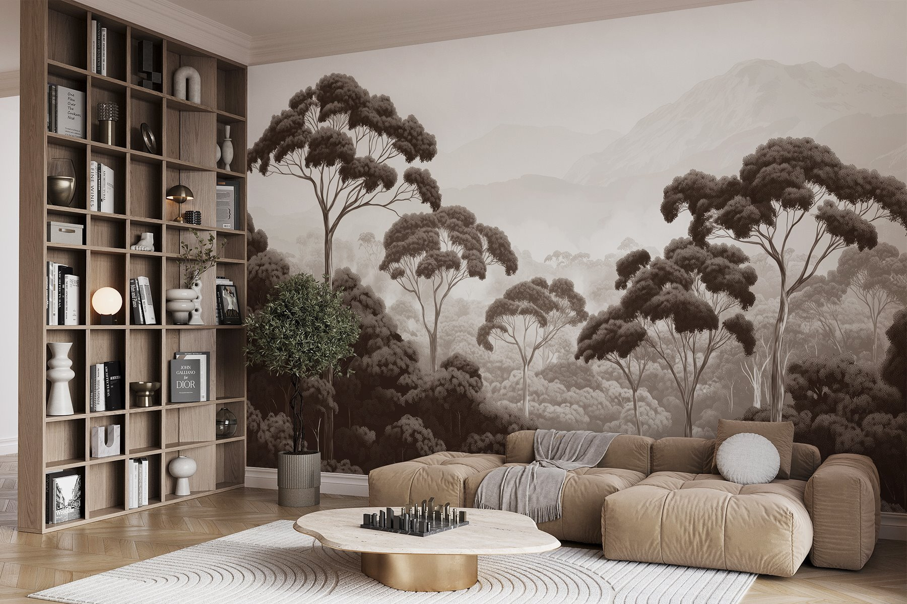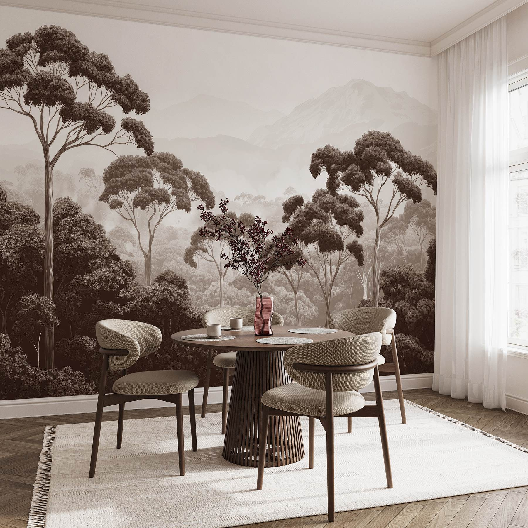 Transformez n’importe quelle pièce en une évasion sereine grâce à cette superbe peinture murale représentant une scène forestière paisible – pensez à des arbres imposants et à des montagnes majestueuses en arrière-plan. Imaginez que vous vous réveillez tous les jours devant cette vue apaisante, comme si la nature elle-même s’était installée dans votre maison. Les tons doux et terreux évoquent un sentiment de paix, parfait pour se détendre ou même ajouter une ambiance douillette pendant les marathons Netflix. C’est un peu comme si vous rameniez un peu de l’extérieur à l’intérieur, sans les insectes et les chaussures boueuses. Envie de rêvasser un peu ? Détendez-vous et laissez vos yeux vagabonder dans ce paysage de rêve. Parfaite pour n’importe quel espace, cette peinture murale donne à chaque mur l’impression d’être un lieu d’évasion.