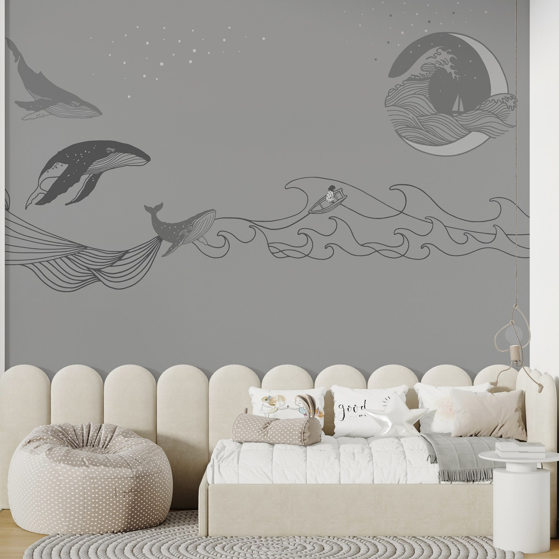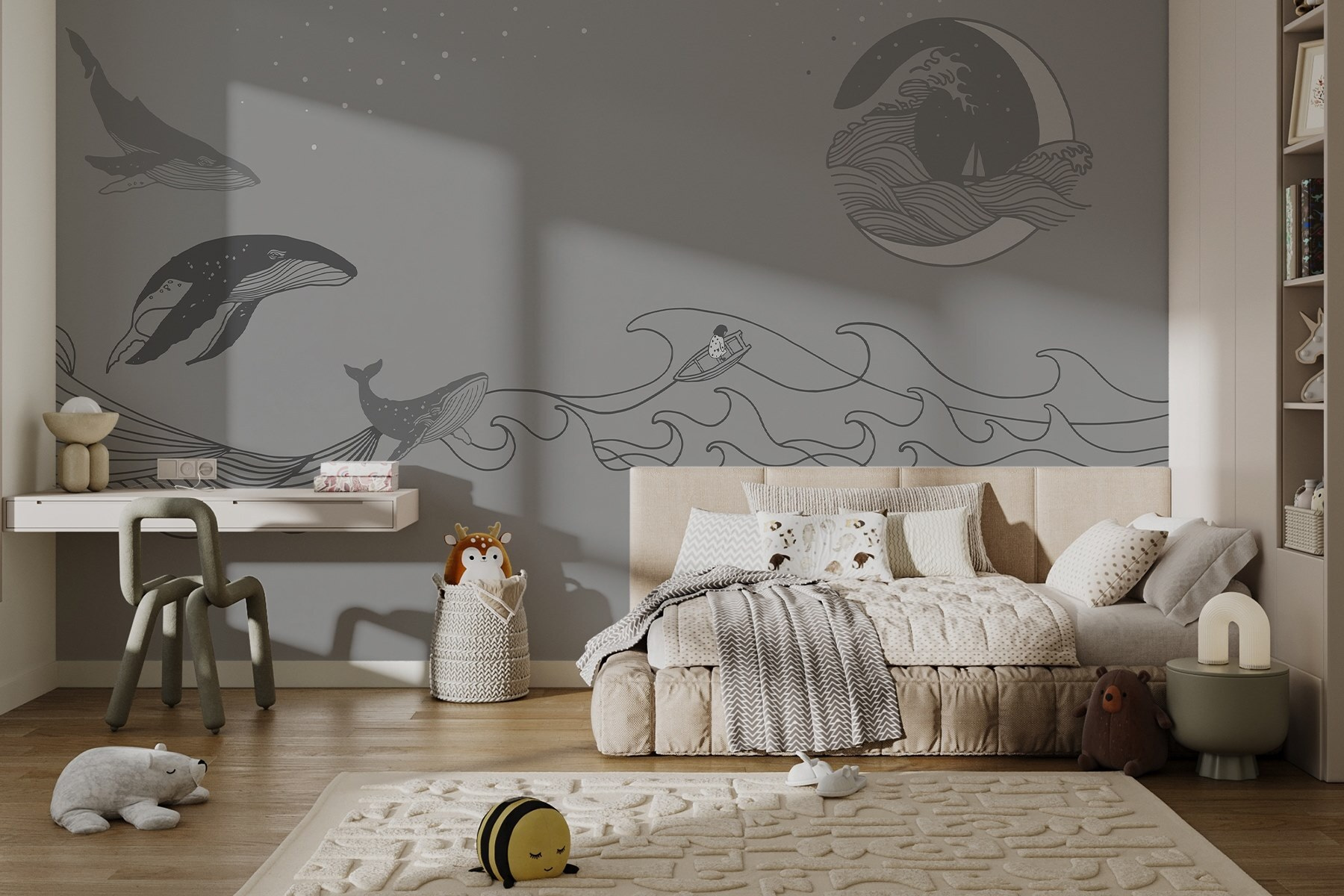 Cette peinture murale apporte une ambiance apaisante, parfaite pour les salons ou les coins douillets. Imaginez que vous sirotiez votre café du matin, en jetant un coup d’œil à ces doux géants, et que vous sentiez tous vos soucis s’envoler – comme une crème solaire par une chaude journée ! Les couleurs douces invitent à la paix, ce qui en fait une toile de fond idéale pour les après-midi de farniente ou les conversations profondes. Plus qu’un simple décor, c’est une expérience qui ne demande qu’à être vécue. Qui sait, il vous inspirera peut-être quelques aventures nautiques !