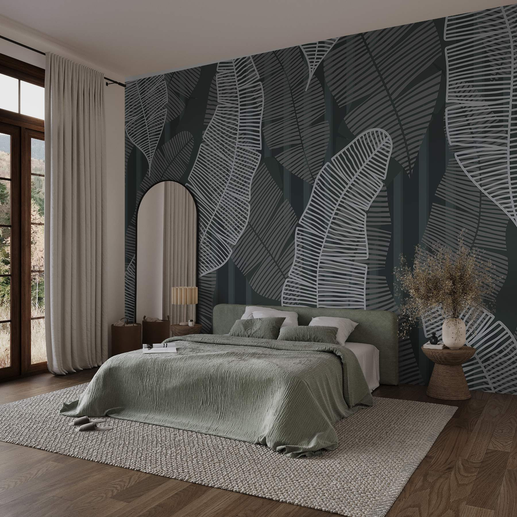 Transformez votre espace avec cette superbe peinture murale présentant un motif de feuilles sur un fond sombre et profond. C’est comme si vous apportiez un morceau des tropiques dans votre salon, l’humidité en moins, bien sûr ! Imaginez que vous sirotiez votre café du matin en ayant l’impression de vous prélasser dans une jungle luxuriante. Les feuilles, magnifiquement détaillées, murmurent presque la douce promesse d’une escapade ensoleillée. Cette peinture murale n’ajoute pas seulement une touche de nature, mais elle joue aussi magnifiquement avec la lumière, créant une ambiance chaleureuse qui convient parfaitement à n’importe quelle pièce. Ce n’est pas seulement un décor, c’est une évasion quotidienne !
