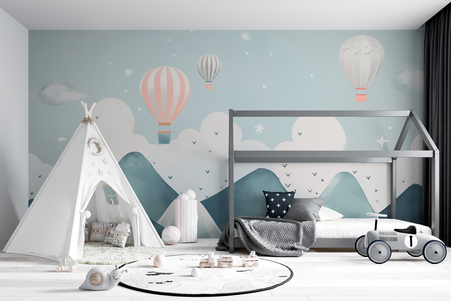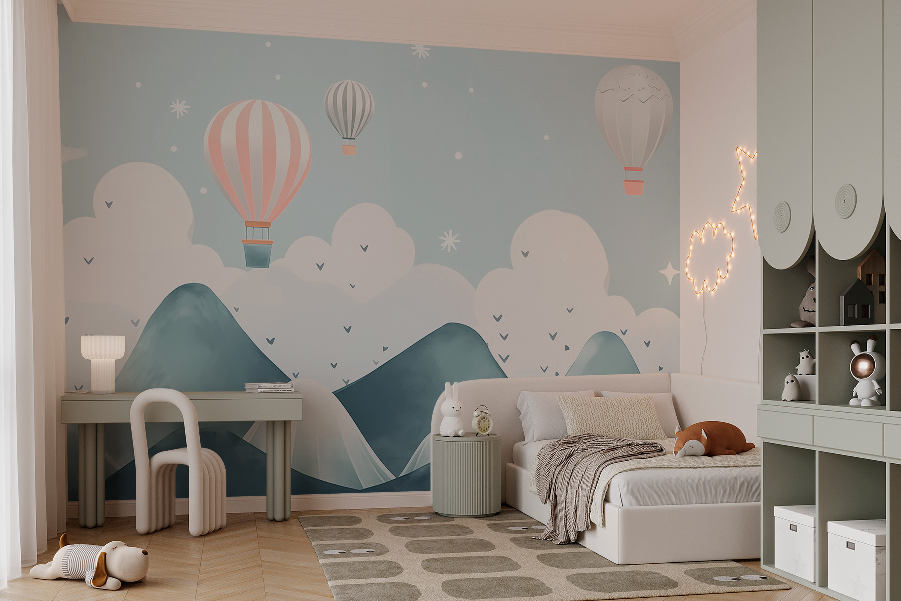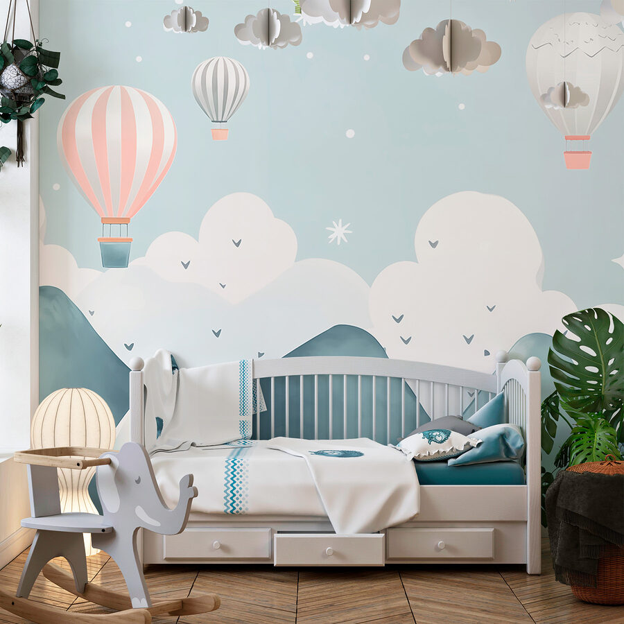 Élevez votre espace avec cette peinture murale enchanteresse représentant des montgolfières dérivant gracieusement au-dessus de montagnes de rêve. Imaginez que vous vous réveillez chaque jour devant cette scène sereine – c’est comme si vous entriez dans une peinture à l’aquarelle ! Les bleus doux et les couleurs douces invitent au calme, ce qui est parfait pour un salon confortable ou une chambre à coucher tranquille. Imaginez des dimanches paresseux avec une tasse de café, la lumière du jour traversant la pièce, tandis que vous rêvez de flotter parmi les nuages. Ajoutez une touche de fantaisie à vos murs – elle pourrait bien vous inspirer une aventure dans votre journée ! Qui sait, peut-être que même le mur commencera à vous chuchoter de doux projets d’évasion.