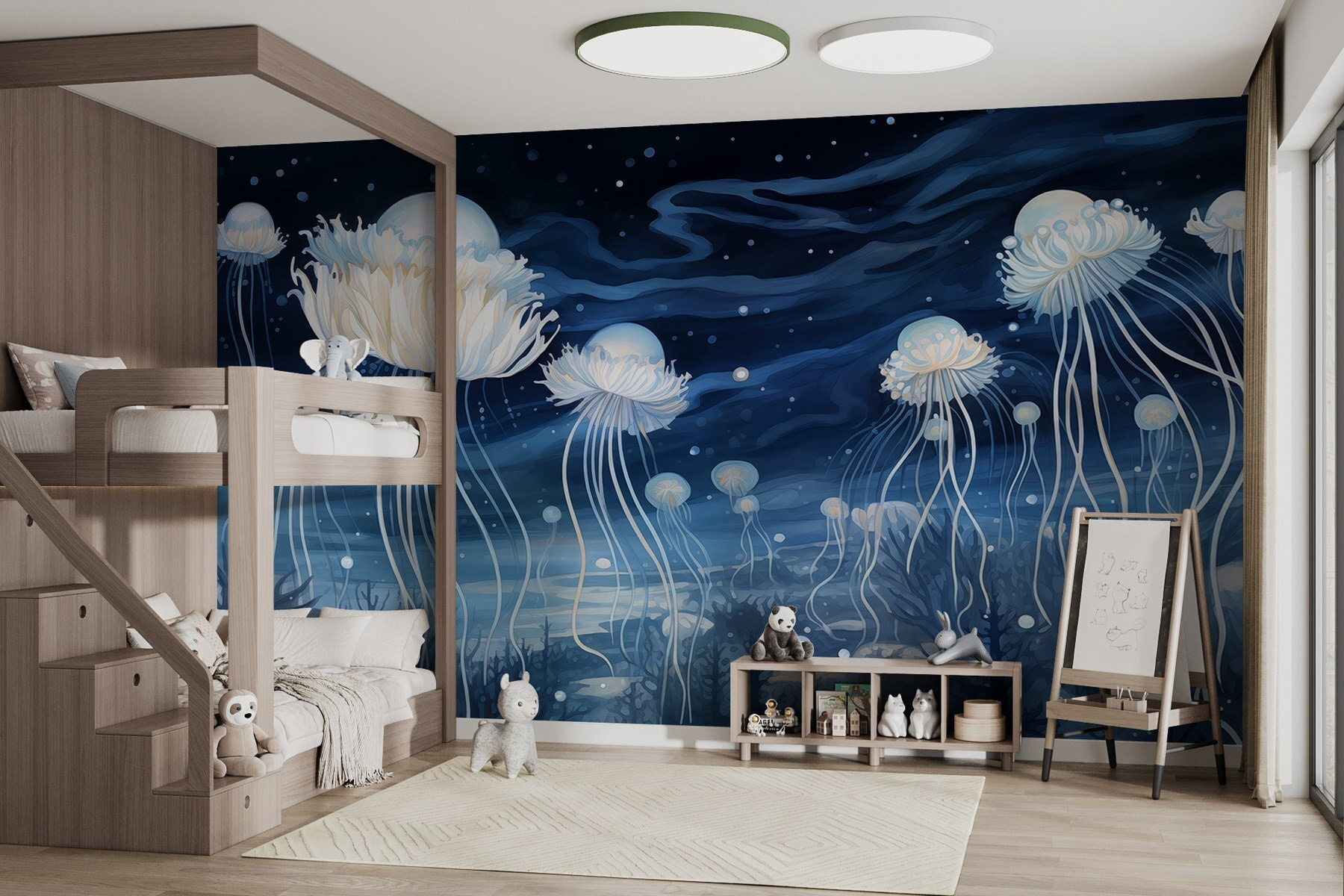 Transformez n’importe quel espace en un paysage de rêve sous-marin apaisant grâce à cette peinture murale époustouflante de méduses glissant dans une nuit étoilée. Imaginez : lorsque vous entrez dans la pièce, vous avez l’impression de flotter dans un océan de tranquillité, n’est-ce pas ? Les bleus et blancs doux des méduses dansent gracieusement, tandis que le ciel nocturne est parsemé d’étoiles minuscules, ce qui donne une ambiance éthérée. Parfait pour un salon ou un coin lecture confortable, vous pourriez vous surprendre à rêvasser, perdu dans vos pensées. C’est aussi un moyen d’engager la conversation ! Vos amis vous demanderont peut-être si vous avez nagé avec des méduses. Imaginez leur surprise lorsque vous répondrez que vous n’avez pas nagé avec des méduses et que vous avez préféré rester à la maison !