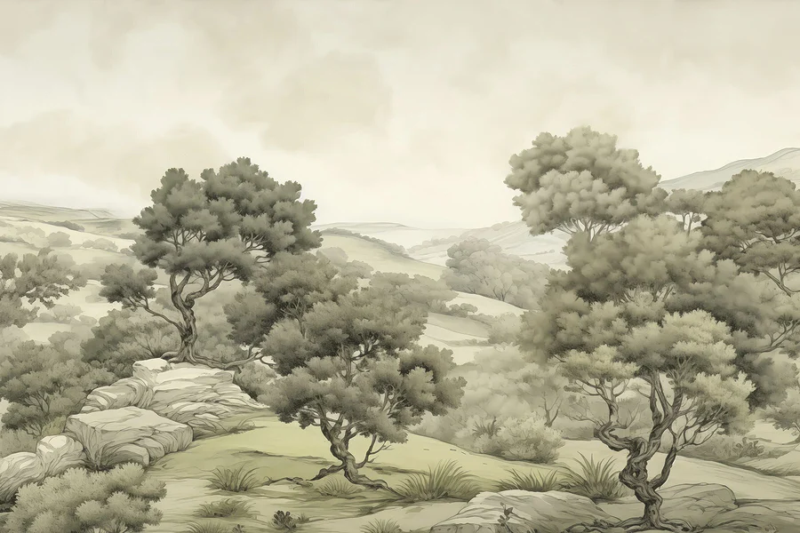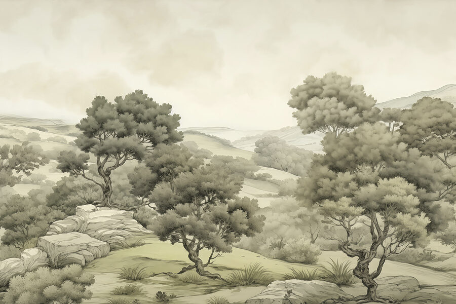 Transform your space into a tranquil retreat with this stunning wall mural, “Landscape with Trees and Rocks.” Imagine waking up each morning feeling as if you’re stepping into a serene forest—how refreshing! The soft, muted tones evoke a sense of calm, making it perfect for living rooms or cozy nooks. It’s like bringing a little slice of nature indoors without worrying about pesky bugs or the weather ruining the vibe.