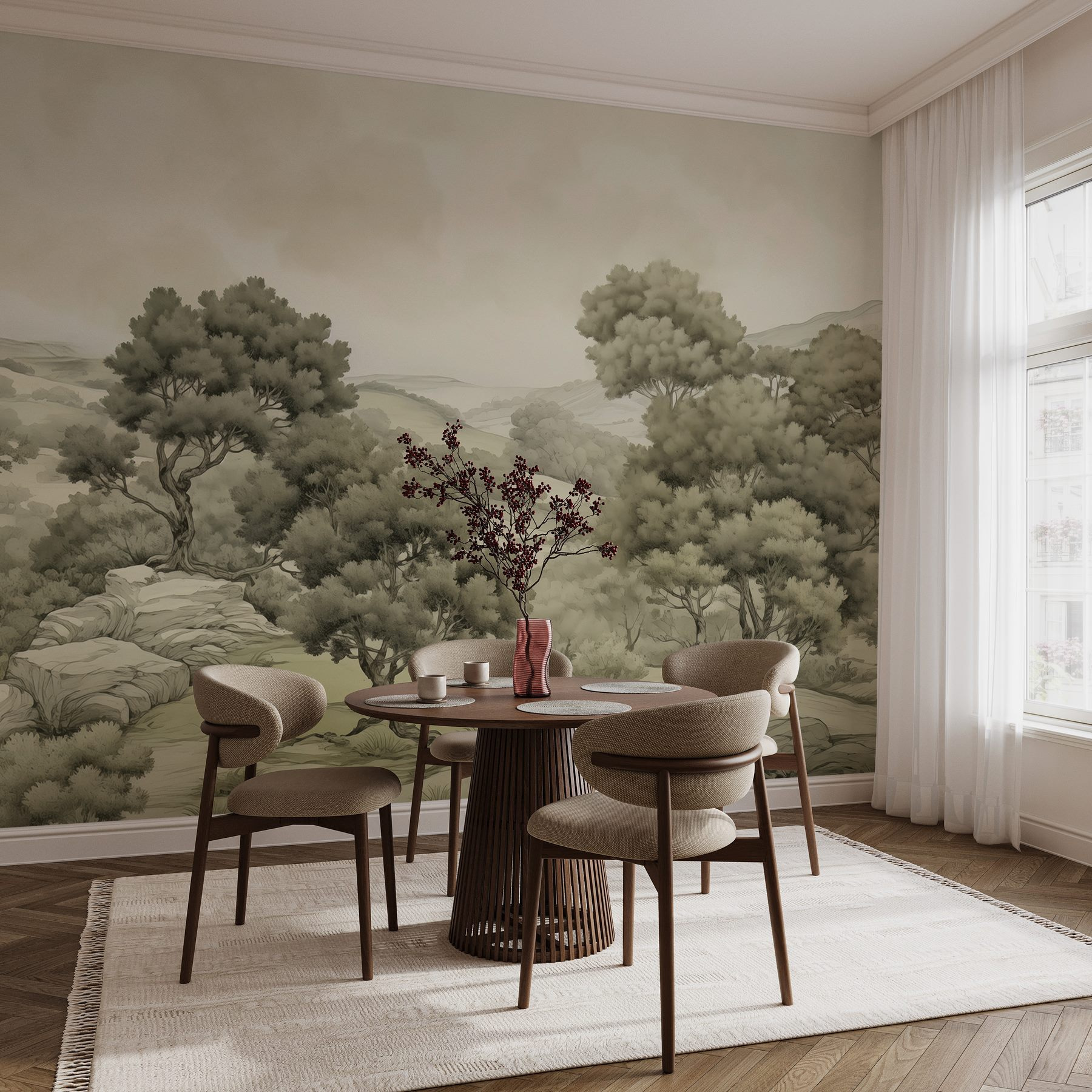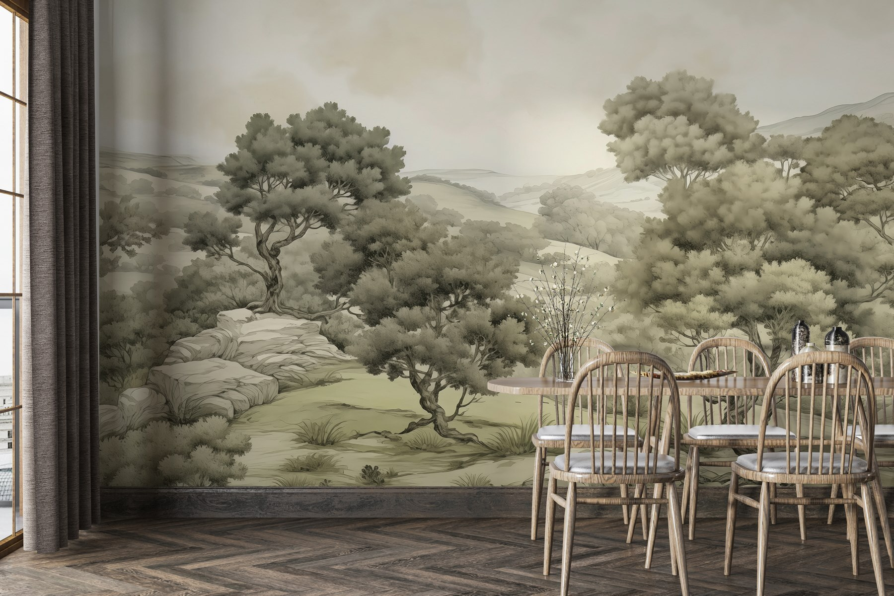Transformez votre espace en un havre de paix grâce à cette superbe fresque murale, « Paysage avec arbres et rochers ». Imaginez-vous vous réveiller chaque matin avec l’impression d’entrer dans une forêt sereine : quel réconfort ! Les tons doux et discrets évoquent un sentiment de calme, ce qui en fait un choix idéal pour les salons ou les coins confortables. C’est comme si vous faisiez entrer un petit bout de nature dans votre intérieur sans avoir à vous soucier des insectes nuisibles ou des intempéries qui pourraient gâcher l’ambiance.