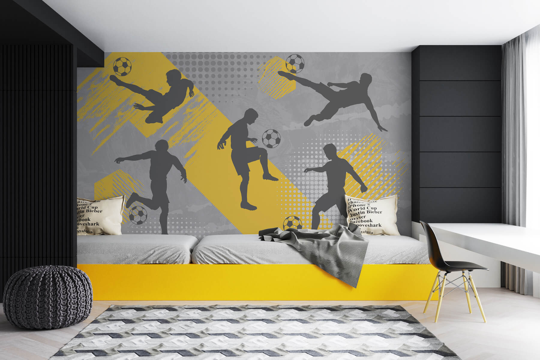Transformez un mur uni en une scène dynamique grâce à cette fresque murale éclatante représentant des hommes jouant au football. C’est comme avoir votre propre mini-stade chez vous. Les silhouettes, pleines d’énergie, capturent le moment parfait d’un coup de pied, d’un saut et toute l’excitation du jeu. Imaginez-vous entrer dans votre chambre et ressentir cette montée d’adrénaline, comme si vous étiez sur le point de rejoindre les joueurs sur le terrain. Avec ses jaunes éclatants contrastant avec ses gris doux, elle ajoute une touche de gaieté et donne vie à n’importe quel espace. Parfaite pour les amateurs de sport ou tous ceux qui aiment apporter un peu de piquant à leur décoration. Préparez-vous à dire adieu à l’ennui !