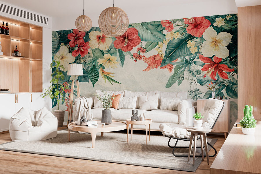Transformez votre espace en un paradis tropical avec cette fresque murale intitulée « Des fleurs éclatantes encadrent un arrière-plan serein ». Imaginez : vous entrez dans votre pièce et boum ! Vous êtes accueilli par des fleurs éclatantes de couleurs, comme si un jour de printemps s’était installé de façon permanente sur votre mur. Le mélange d’hibiscus rouges, de jaunes crème et de verts profonds crée un délice sensoriel, comme si la nature avait lancé des confettis. Imaginez-vous en train de siroter votre café du matin ici ; il est facile d’oublier le monde extérieur. De plus, cela apporte une ambiance de vacances dans votre maison, sans avoir besoin de crème solaire. Parfaite pour un salon ou un coin confortable, cette fresque murale a du caractère et du charme. Qui ne voudrait pas d’un petit morceau de la beauté de la nature encadré avec autant de style ?
