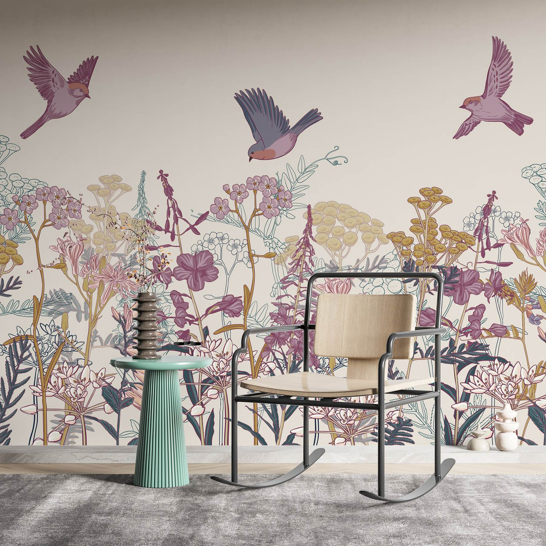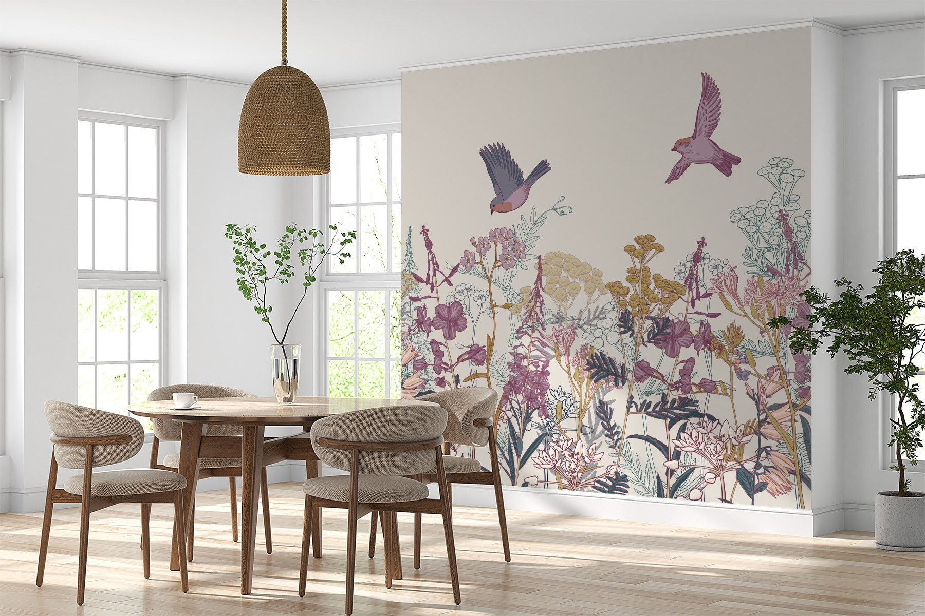 Imagine stepping into a serene garden where colorful birds flit through fragrant blooms. This “Birds Flying Over Flowers” mural does just that, transforming any room into a delightful escape. The soft, pastel palette adds a gentle charm, making it feel like a breath of fresh air on a lazy Sunday morning. Picture a cozy reading nook or a lively dining area enlivened by this enchanting scene. It’s like having a slice of nature right on your walls, inviting smiles and sparking conversations. Who wouldn’t want that kind of vibe in their space? It’s a little reminder of the beauty in the everyday. Let the birds soar, and let your spirit fly with them!