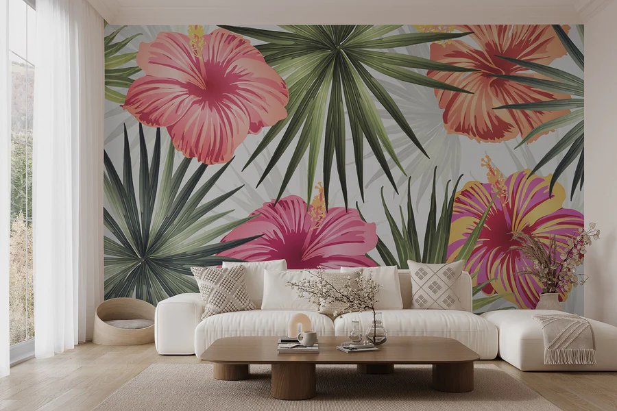 Brighten up any room with this mural, featuring a burst of vibrant tropical flowers that could make even a gloomy day feel like a beach vacation. Imagine stepping into your own personal rainforest, where colors pop and the air feels a bit lighter. Those cheeky hibiscus blooms almost seem to dance, bringing a sense of liveliness right to your walls. Perfect for a cozy nook or an open space that needs a little love, this wall art whispers, “Let’s celebrate nature.” Plus, it might even inspire a tropical cocktail night—who doesn’t love an umbrella in their drink? Add this splashing burst of color and let the joy in!