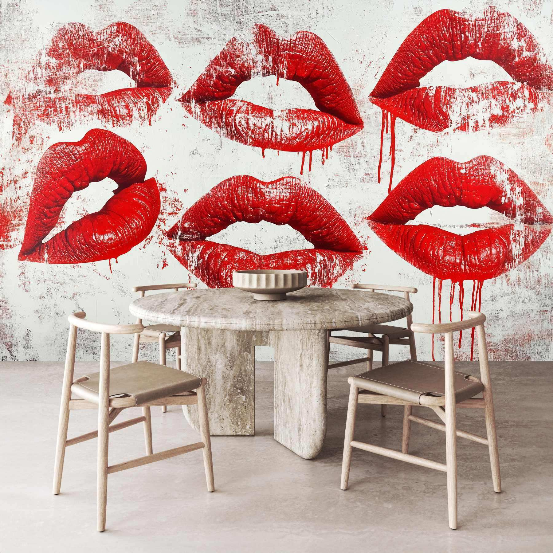 Step into a world that’s equal parts bold and playful with this “Group of Red Lips with Dripping Blood” mural. Imagine these luscious, red lips bringing an unexpected pop to your space—like they just had a little too much fun at a party. The striking contrast against the white background adds a dramatic flair, sparking conversations faster than your friend’s wild stories. Perfect for a bedroom, studio, or even that cozy nook where you sip your morning coffee. It’s a little cheeky, a tad edgy, and oh-so unforgettable. Just picture the vibes—sassy, fun, and definitely full of life. Who wouldn’t want a touch of playful drama on their wall?