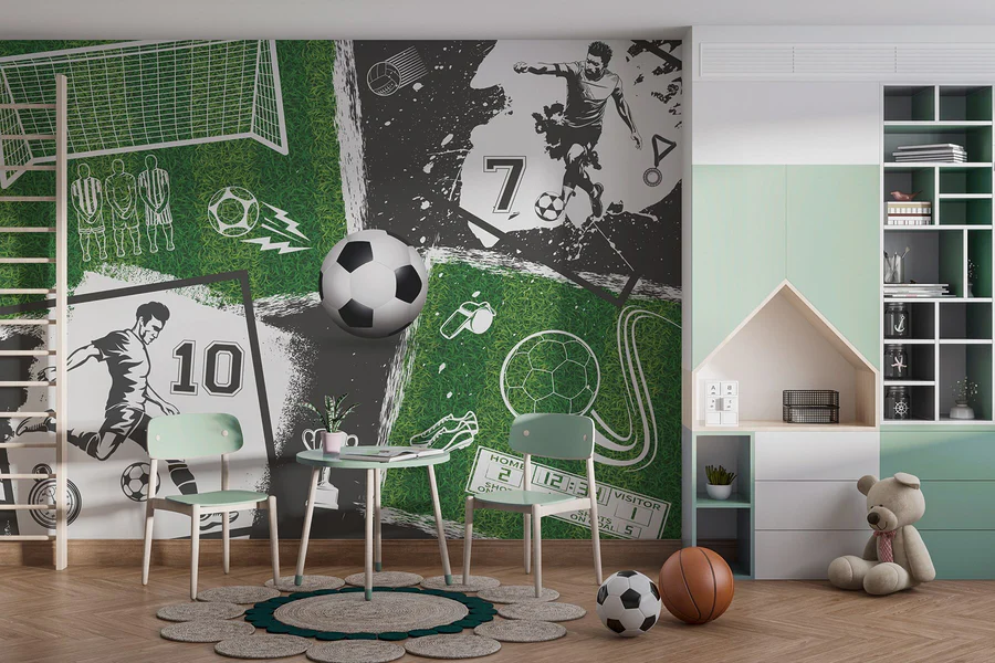 The kicks, the goals, the suspense! It doesn’t just look cool; it makes you feel pumped. Whether it’s game day or just another Tuesday, this mural brings an electric vibe. Perfect for kids, enthusiastic fans, or anyone wanting to add a fun pop to their decor. Every glance transports you to the field, and who knows? You might even feel the urge to kick back with a soccer ball.