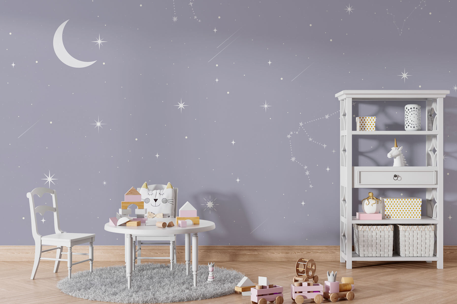 Transformez n’importe quelle pièce en un lieu de rêve avec la peinture murale “Lune et étoiles dans le ciel”. C’est comme si vous aviez un morceau de ciel nocturne chez vous, parfait pour les amateurs d’étoiles ou tous ceux qui ont besoin d’un peu de magie dans leur vie. Imaginez que vous vous blottissez dans votre lit, que vous contemplez la douce lueur de la lune et que vous laissez votre esprit vagabonder. Les enfants adoreront transformer leur espace en une aventure céleste. De plus, c’est un excellent moyen d’engager la conversation avec les invités. Qui n’aurait pas envie de parler de la beauté de l’univers ? Décoratif et réconfortant, c’est un moyen facile de créer une atmosphère chaleureuse.