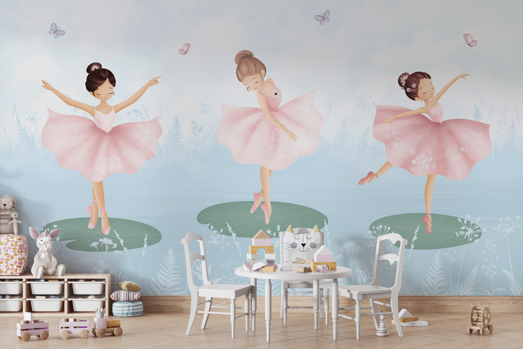 Transformez la chambre d’un enfant en un pays des merveilles avec cette peinture murale fantaisiste représentant un trio de charmantes filles dansant en tutu rose sur des nénuphars. Imaginez les rires des enfants lorsqu’ils apercevront les papillons qui voltigent autour d’eux, ajoutant une touche d’enchantement à leurs jeux. C’est comme si vous invitiez un conte de fées à la maison. Parfaite pour stimuler l’imagination à l’heure du conte ou simplement pour égayer un coin douillet, cette peinture murale apporte une ambiance ludique qui peut faire sourire tout le monde. Imaginez : des chaussures qui dansent, des rires et une touche de joie dans chaque regard.