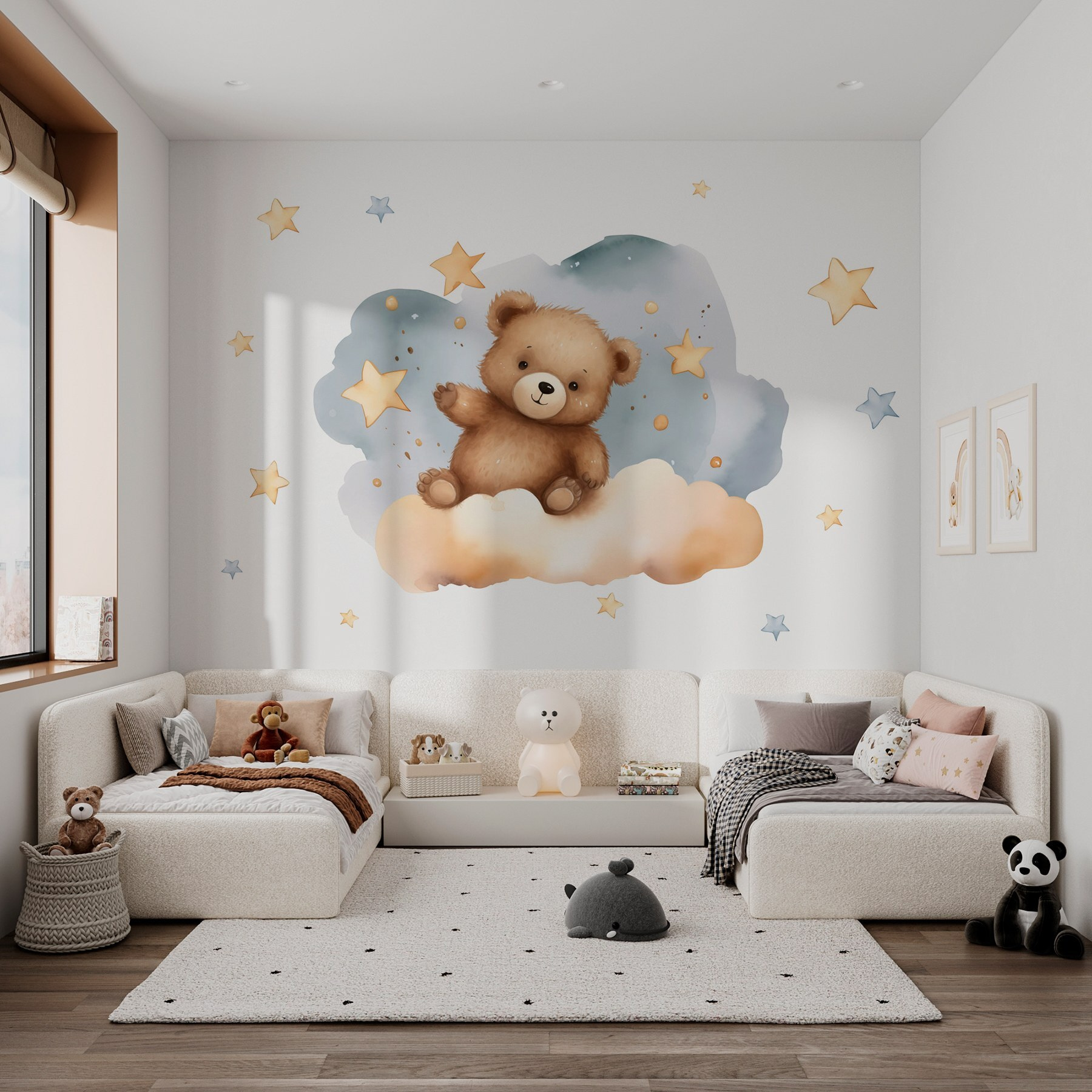 Transform any space into a dreamy wonderland with the “Teddy Bear on a Cloud” mural! Picture this: a fluffy teddy bear nestled on a cloud, waving hello like it just spotted you from across the room. The soft blues and gentle yellows create a cozy, serene vibe—perfect for a nursery or playroom. Imagine little ones gazing up at this adorable scene, drifting off to sleep while dreaming of fluffy clouds and starry nights. This mural doesn’t just look cute; it wraps the room in warmth and whimsy. It’s like having a magical friend hang out on your wall, ready to inspire sweet dreams and endless smiles! Plus, it’s a great conversation starter—who wouldn’t swoon over such a delightful little bear?