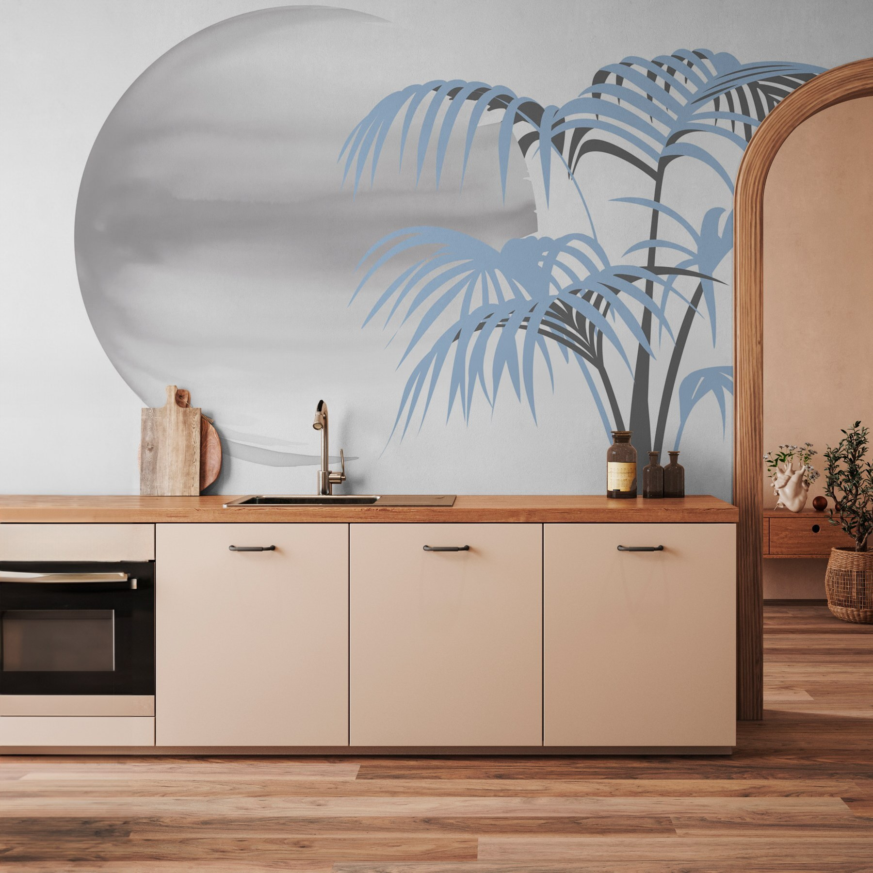 Step into a slice of tranquility with this stunning mural featuring a tree draped in leaves, nestled beside a dreamy white circle that softly suggests the moon. Imagine waking up every day to this gentle scene—it’s like having your own personal escape right on your wall. The soothing colors invite you to slow down, maybe sip your coffee a little longer, or daydream about tropical shores. It’s perfect for transforming that dull corner into a vibrant oasis. Friends will wander in and feel instantly relaxed, maybe even wonder if you’ve taken a trip to paradise. Nature’s beauty at home? Yes, please!