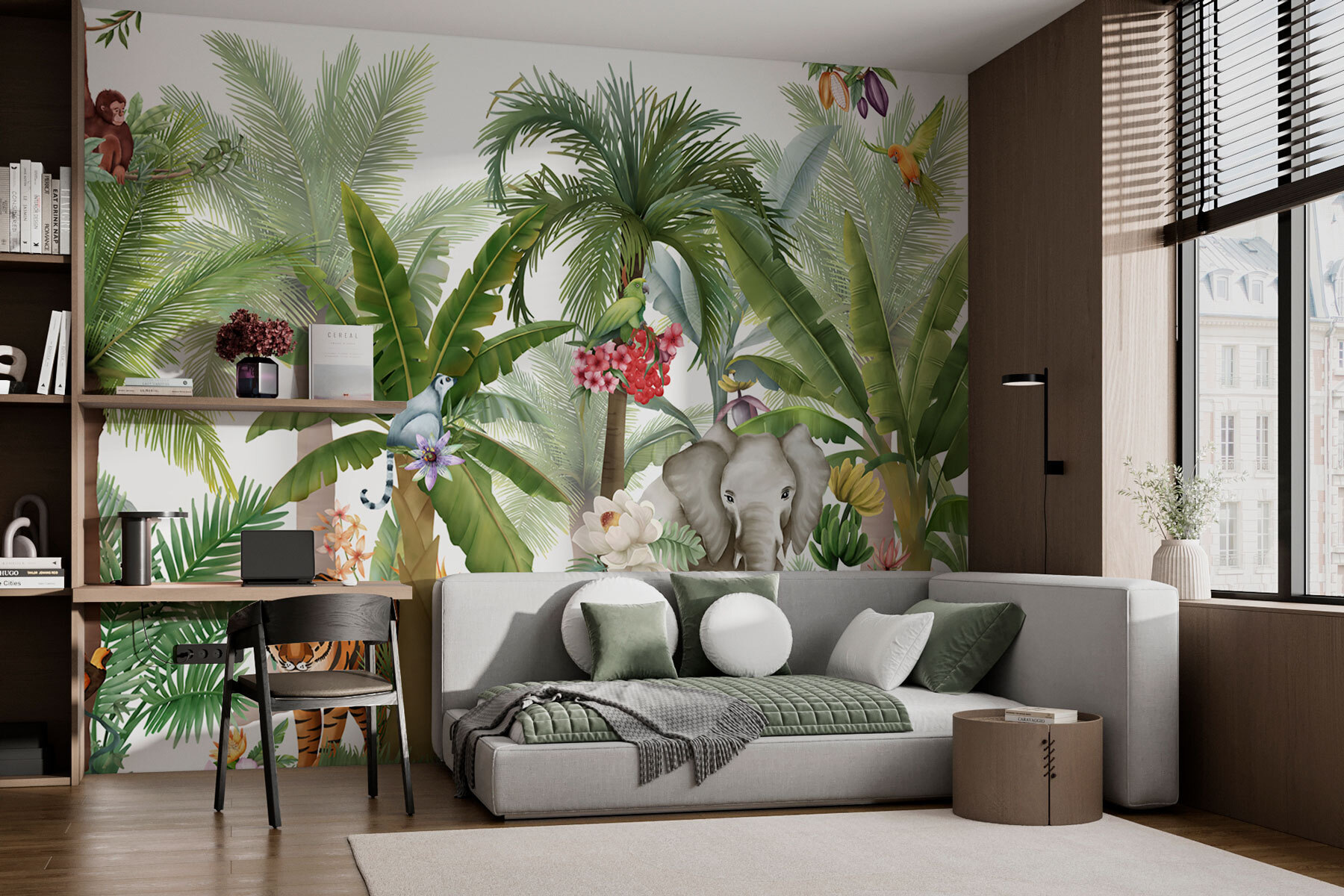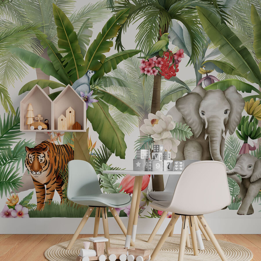 Transformez votre espace avec cette fresque murale représentant une jungle animée, où des singes espiègles se balancent et des éléphants majestueux se promènent. C’est comme si vous plongiez dans une forêt tropicale vivante, sans les piqûres de moustiques ! La végétation luxuriante et les oiseaux colorés créent un décor à la fois apaisant et vivifiant. Imaginez-vous en train de siroter votre café du matin tout en profitant de la chaleur du soleil et de la douce brise… Oh, mais attendez, vous êtes simplement dans votre salon confortable ! Parfaite pour les amoureux des animaux, cette fresque murale fait entrer la nature sauvage dans votre intérieur, suscitant la joie et donnant à chaque instant un goût d’aventure. Profitez de l’ambiance tropicale toute l’année !