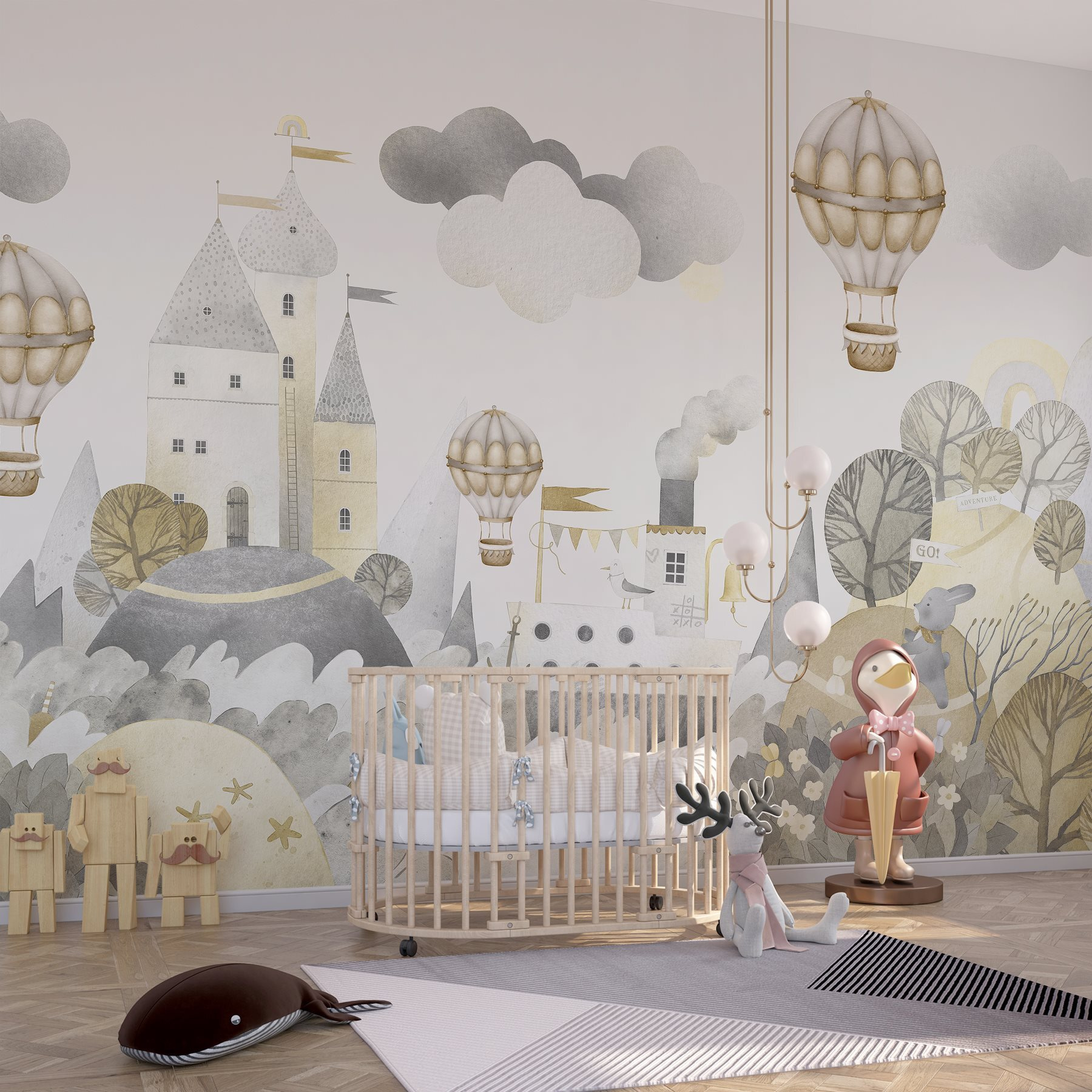 Transformez une pièce en une aventure fantaisiste grâce à cette ravissante fresque aquarelle représentant un château de rêve et de charmantes montgolfières. Imaginez des enfants errant dans ces contrées enchantées, leur imagination s’envolant aussi haut que ces ballons. Les couleurs douces et les détails charmants créent une ambiance chaleureuse et spacieuse, parfaite pour les salles de jeux ou les chambres d’enfants. Imaginez ces moments tranquilles, à lire des histoires sous le regard bienveillant d’un château accueillant. Vous entendrez presque le doux vrombissement des montgolfières et les rires des petits qui explorent leur nouveau royaume. Chaque regard posé sur cette fresque murale promet une étincelle de joie et d’inspiration. Qui ne voudrait pas plonger dans ce conte de fées ?