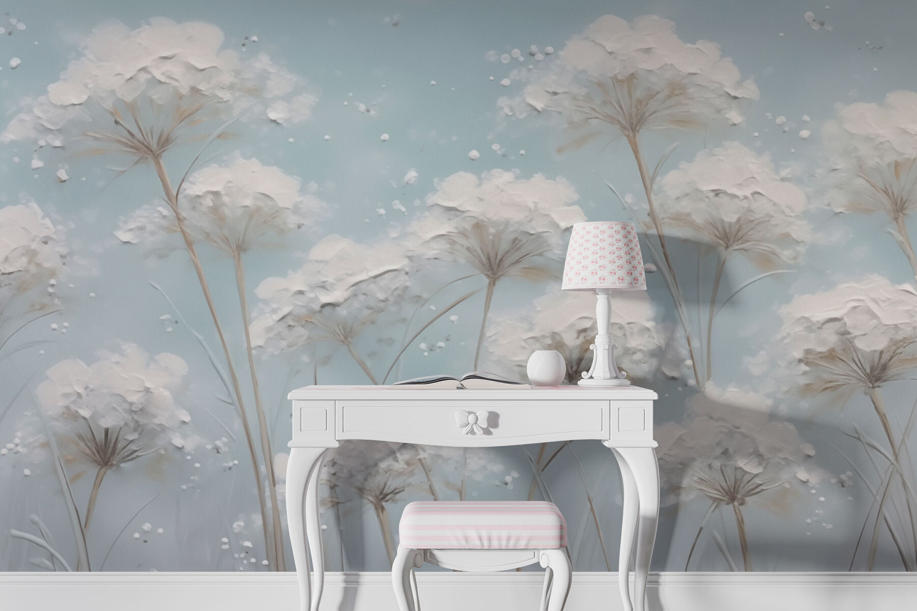 Transformez n’importe quel mur avec cette peinture murale enchanteresse qui fait entrer des champs de fleurs dans votre maison. Imaginez une toile de fond bleue sereine parsemée de fleurs délicates se balançant doucement dans une brise légère. C’est comme entrer dans un rêve éveillé ou respirer un matin de printemps. Cette peinture murale invite à la chaleur et au calme, ce qui la rend parfaite pour les coins lecture confortables ou les salons animés. Imaginez que vous puissiez siroter un thé ou partager des rires dans un espace qui ressemble à un câlin de la nature – doux, accueillant et d’une gaieté inépuisable. Parfait pour ceux qui aiment une touche de fantaisie équilibrée par l’élégance !