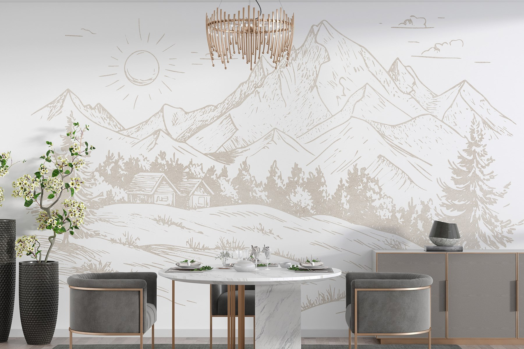 Papier peint Dessin d’un paysage avec des montagnes et des arbres (UGS: w03348)