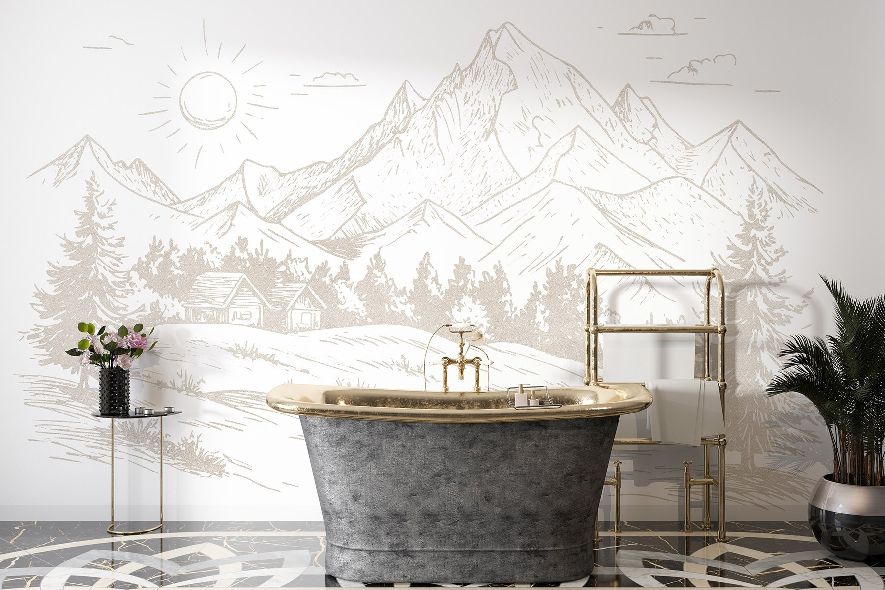 Papier peint Dessin d'un paysage avec des montagnes et des arbres Papier peint Dessin d'un paysage avec des montagnes et des arbres
