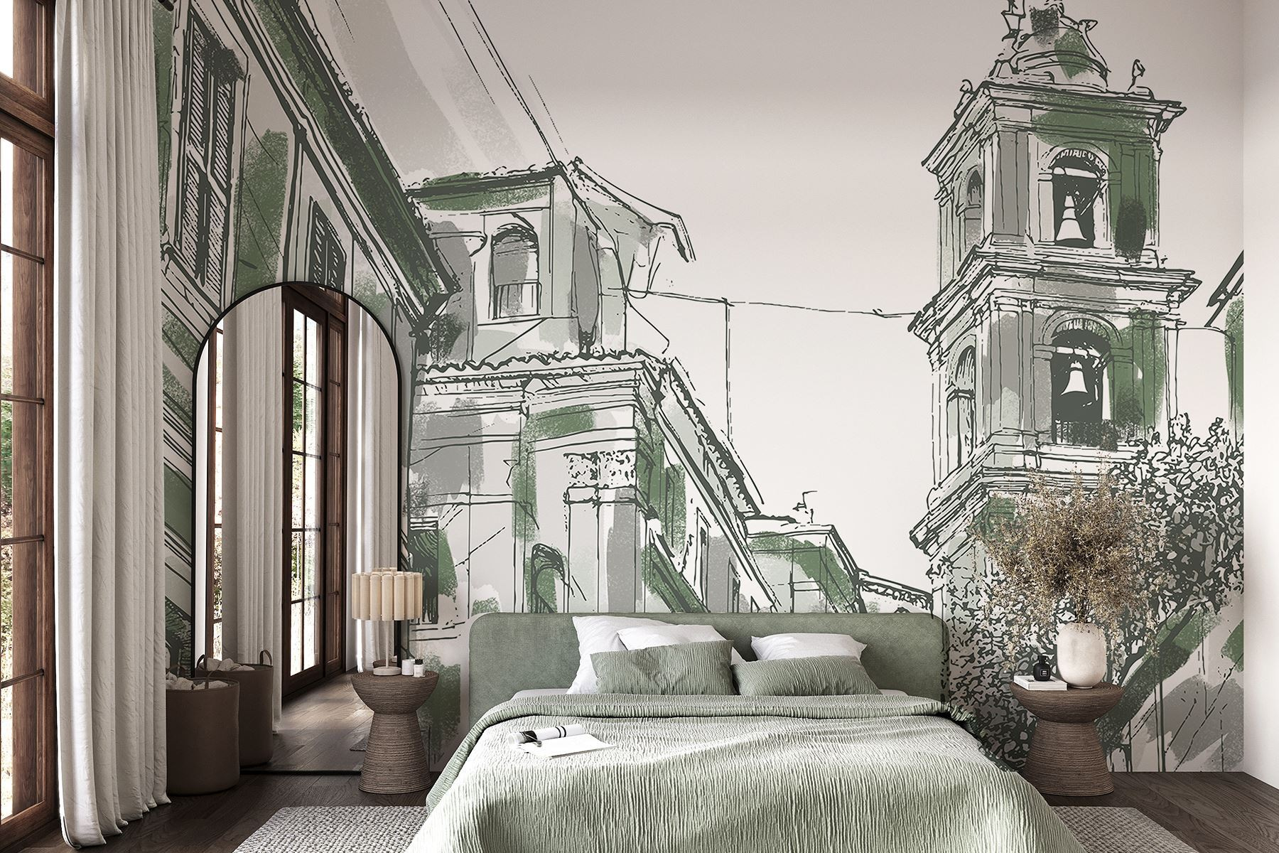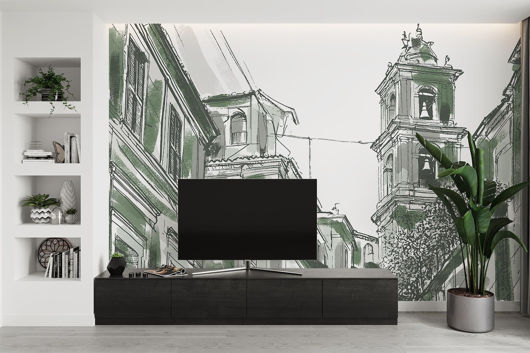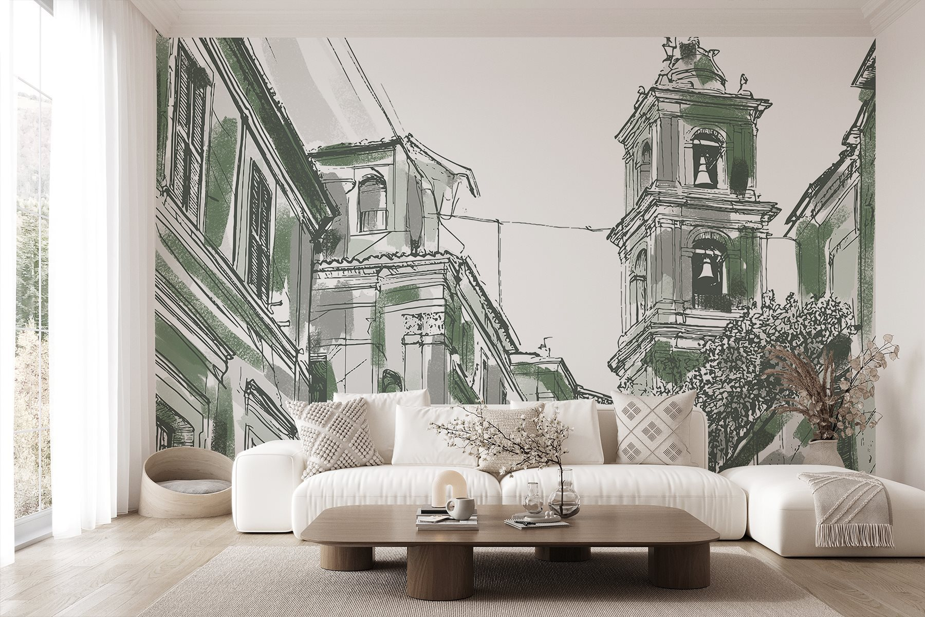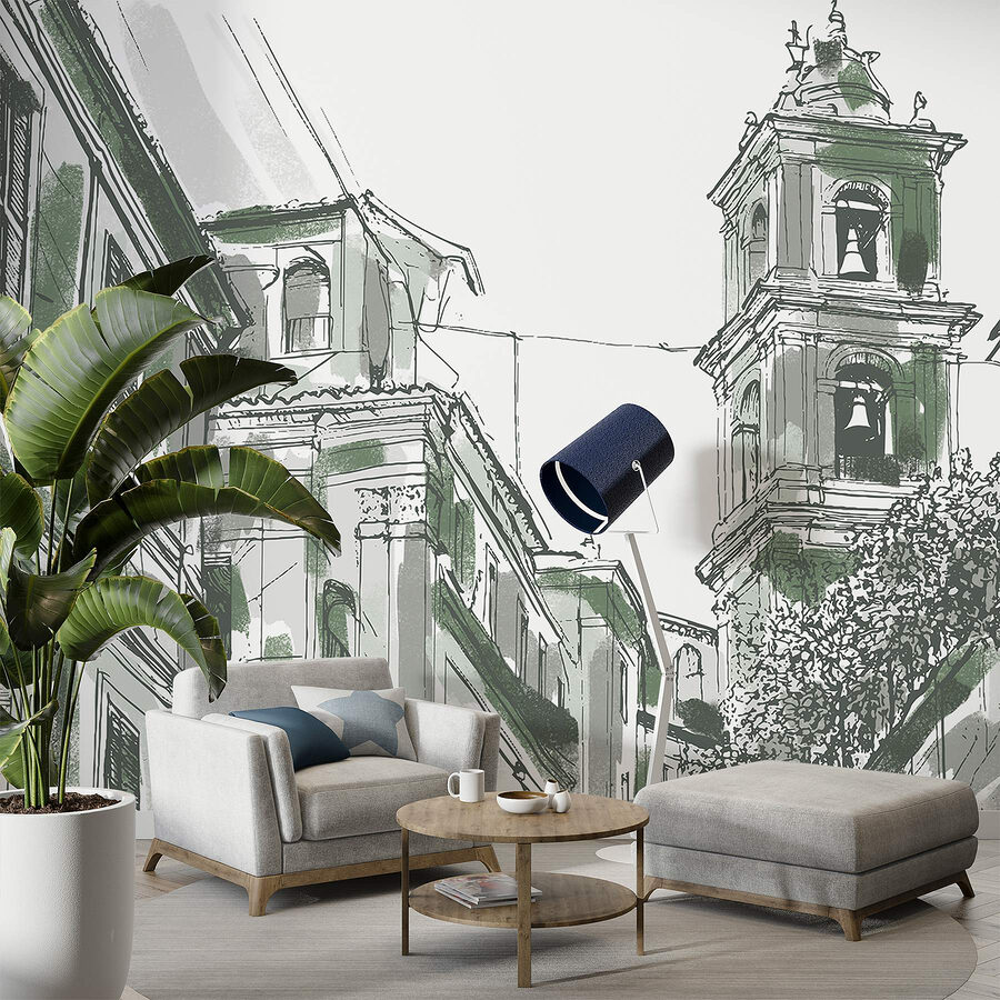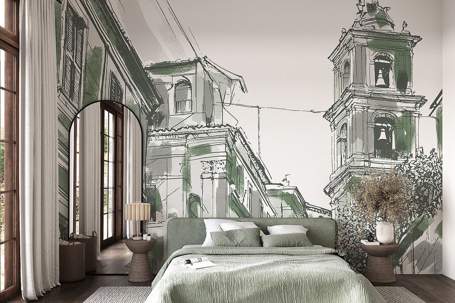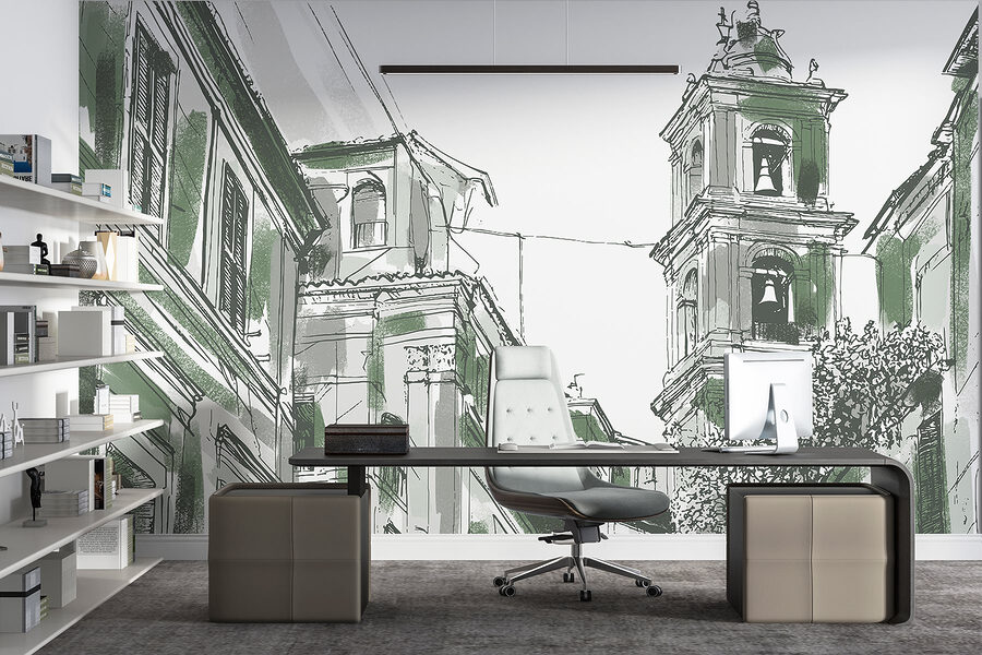 Apportez une touche de charme urbain à votre espace avec cette peinture murale enchanteresse. Imaginez le dessin captivant d’un bâtiment orné de cloches, murmurant des histoires d’une vie urbaine animée. Les verts doux et les lignes complexes vous invitent à jeter un coup d’œil dans un paysage de rue à la fois serein et animé, éveillant l’imagination. Imaginez-vous en train de siroter un café, de contempler cette peinture murale et de sentir la chaleur de la communauté et de l’histoire vous entourer. Parfaite pour les salons, les cafés ou les coins lecture, elle ajoute de la personnalité sans dominer l’espace. C’est comme si vous aviez un petit morceau de la magie de la ville chez vous.