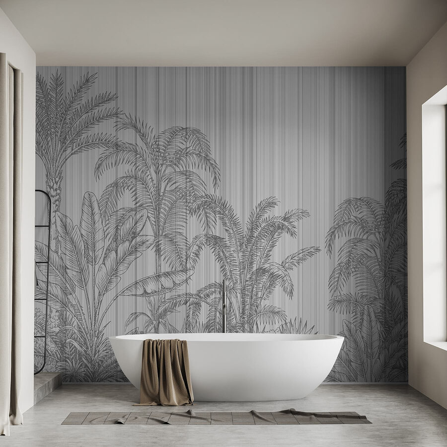 Transformez votre espace avec cette superbe peinture murale qui évoque l’oasis tropicale sans qu’il soit nécessaire d’appliquer de la crème solaire. La toile de fond grise et blanche avec des palmiers ajoute une touche de sophistication calme. Imaginez que vous entrez dans votre chambre et que vous vous sentez instantanément dans une île sereine.