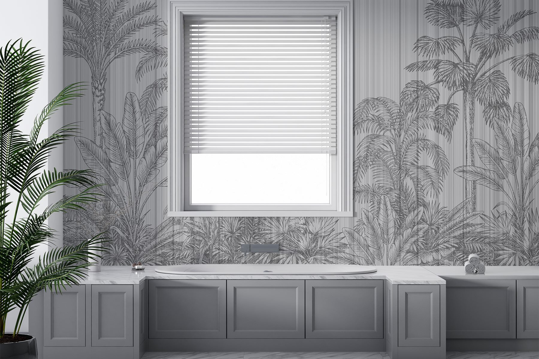 Transformez votre espace avec cette superbe peinture murale qui évoque l’oasis tropicale sans qu’il soit nécessaire d’appliquer de la crème solaire. La toile de fond grise et blanche avec des palmiers ajoute une touche de sophistication calme. Imaginez que vous entrez dans votre chambre et que vous vous sentez instantanément dans une île sereine.