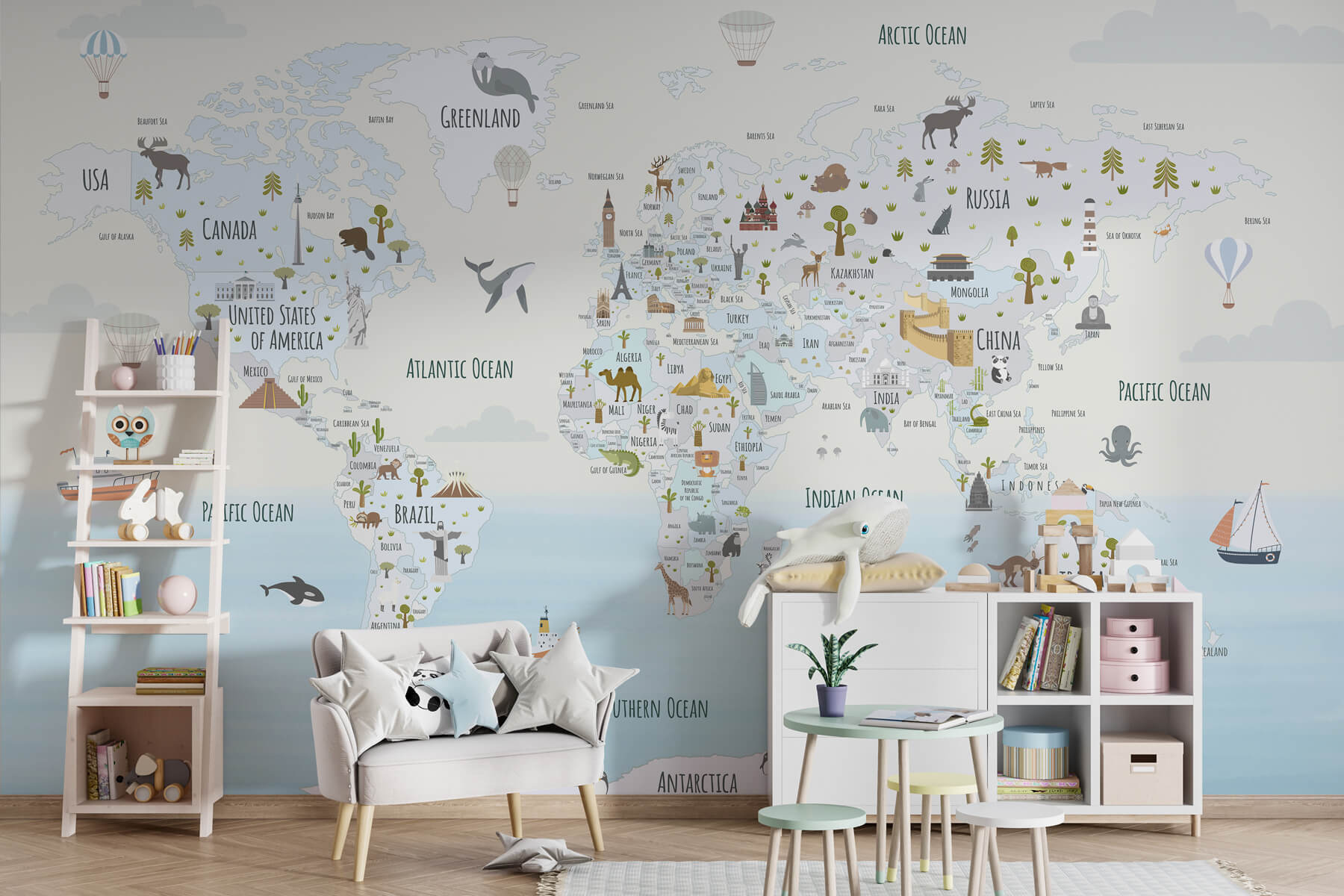 Transformez n’importe quel espace avec cette ravissante peinture murale représentant une carte du monde colorée parsemée de charmants animaux. Parfaite pour les enfants curieux ou les jeunes de cœur, elle stimule l’imagination et l’aventure. Imaginez un enfant qui montre du doigt ses créatures préférées tout en rêvant de contrées lointaines – de la magie à l’état pur ! Les teintes douces créent une ambiance relaxante, idéale pour les chambres à coucher ou les salles de jeux. C’est comme une invitation à l’exploration, à l’apprentissage et à la rêverie. Une pièce maîtresse étonnante qui donne vie aux murs et fait de chaque regard un petit voyage !