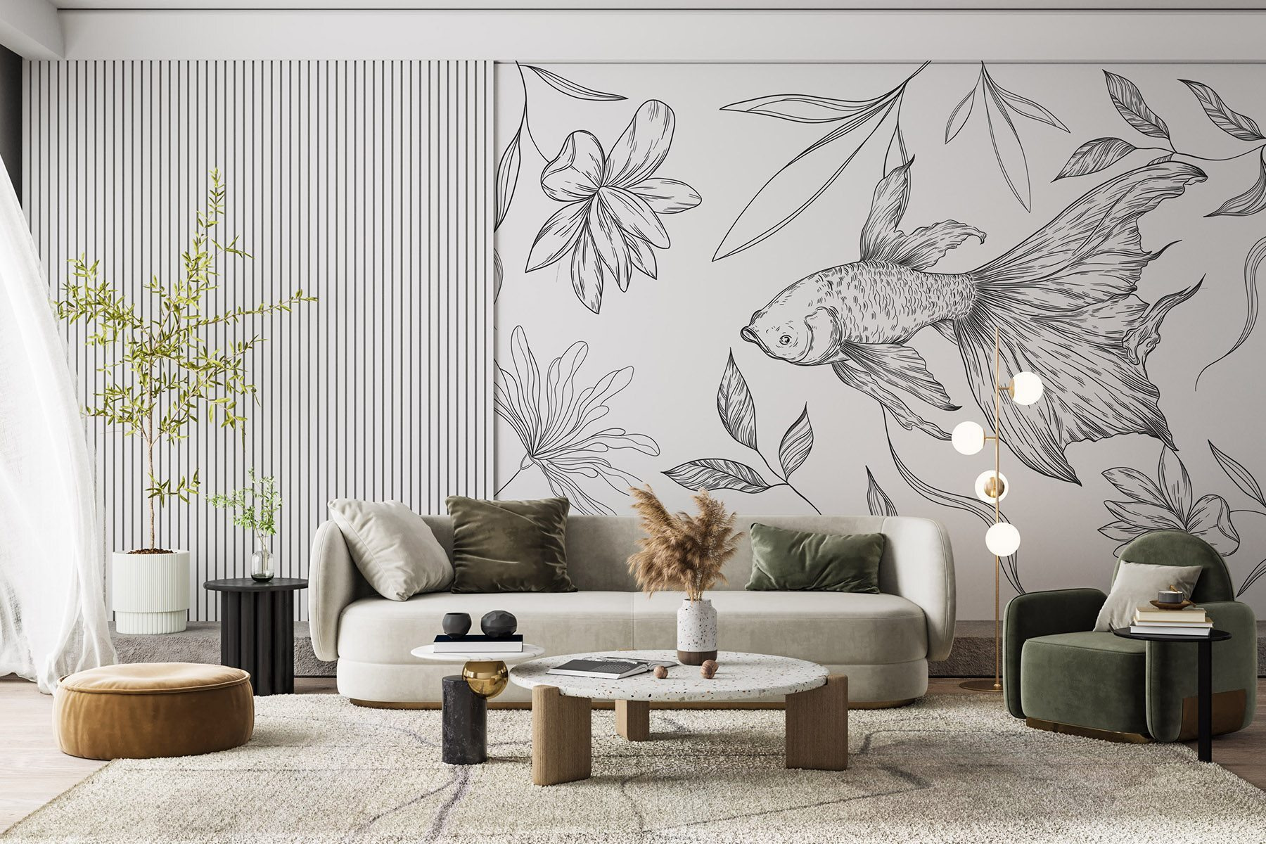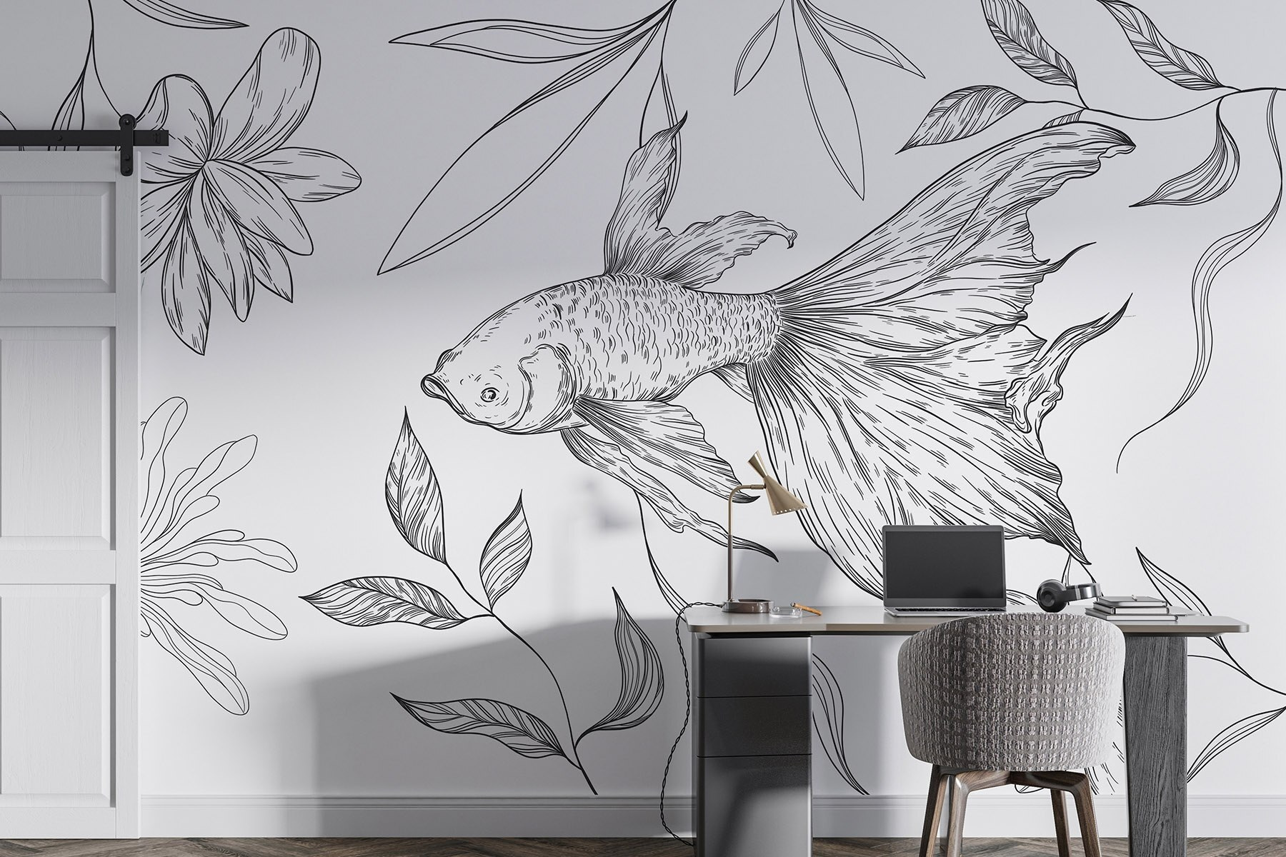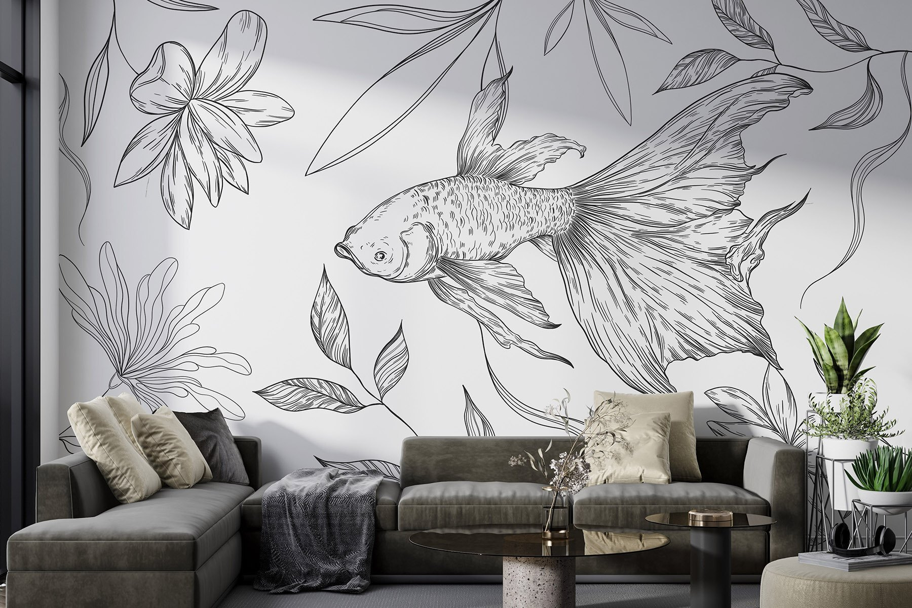 Transformez n’importe quel espace avec cette peinture murale captivante représentant un charmant poisson glissant parmi des plantes délicates. Le design en noir et blanc apporte une touche unique, ajoutant une touche d’élégance sans surcharger la pièce. Imaginez-vous en train de siroter un café, les douces lignes dansant sur le mur, suscitant des pensées apaisantes et des idées créatives. C’est comme un murmure de la nature, qui invite à la paix dans l’agitation. Parfait pour tous ceux qui souhaitent répandre un peu de magie artistique sur leurs murs, il permet également d’engager la conversation. Qui n’aurait pas envie de parler de son “compagnon de baignade” sur son mur ?