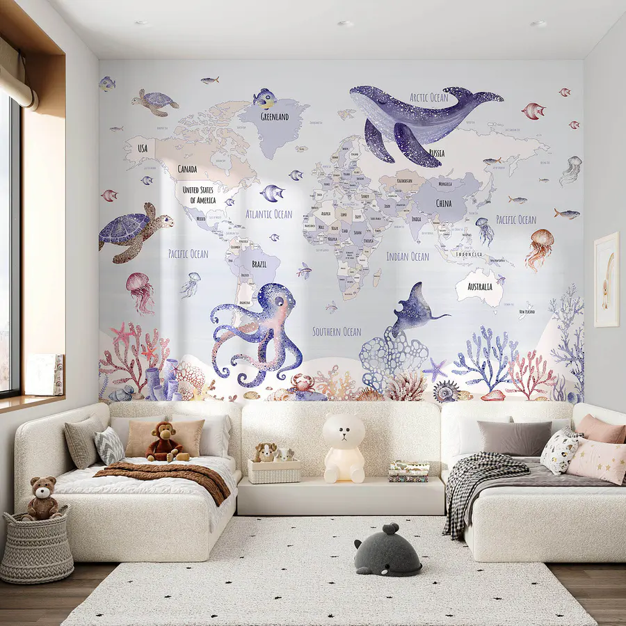 Transformez n’importe quelle pièce en une mini-aventure grâce à cette ravissante peinture murale, qui représente une charmante carte du monde enveloppée d’une multitude d’animaux marins. Imaginez les sourires qu’elle suscitera, invitant vos petits explorateurs à découvrir des contrées lointaines tout en étant entourés de tortues fantasques, de pieuvres enjouées et de gentilles baleines. Ce n’est pas seulement une peinture murale, c’est comme si vous aviez votre propre histoire sur le thème de l’océan qui n’attend que de se dérouler. Parfaite pour les salles de jeux ou les coins douillets, elle éveillera la curiosité, enflammera l’imagination et transformera peut-être même un mardi ennuyeux en un rêve éveillé sous la mer. Qui sait, il pourrait bien inspirer un futur biologiste marin !