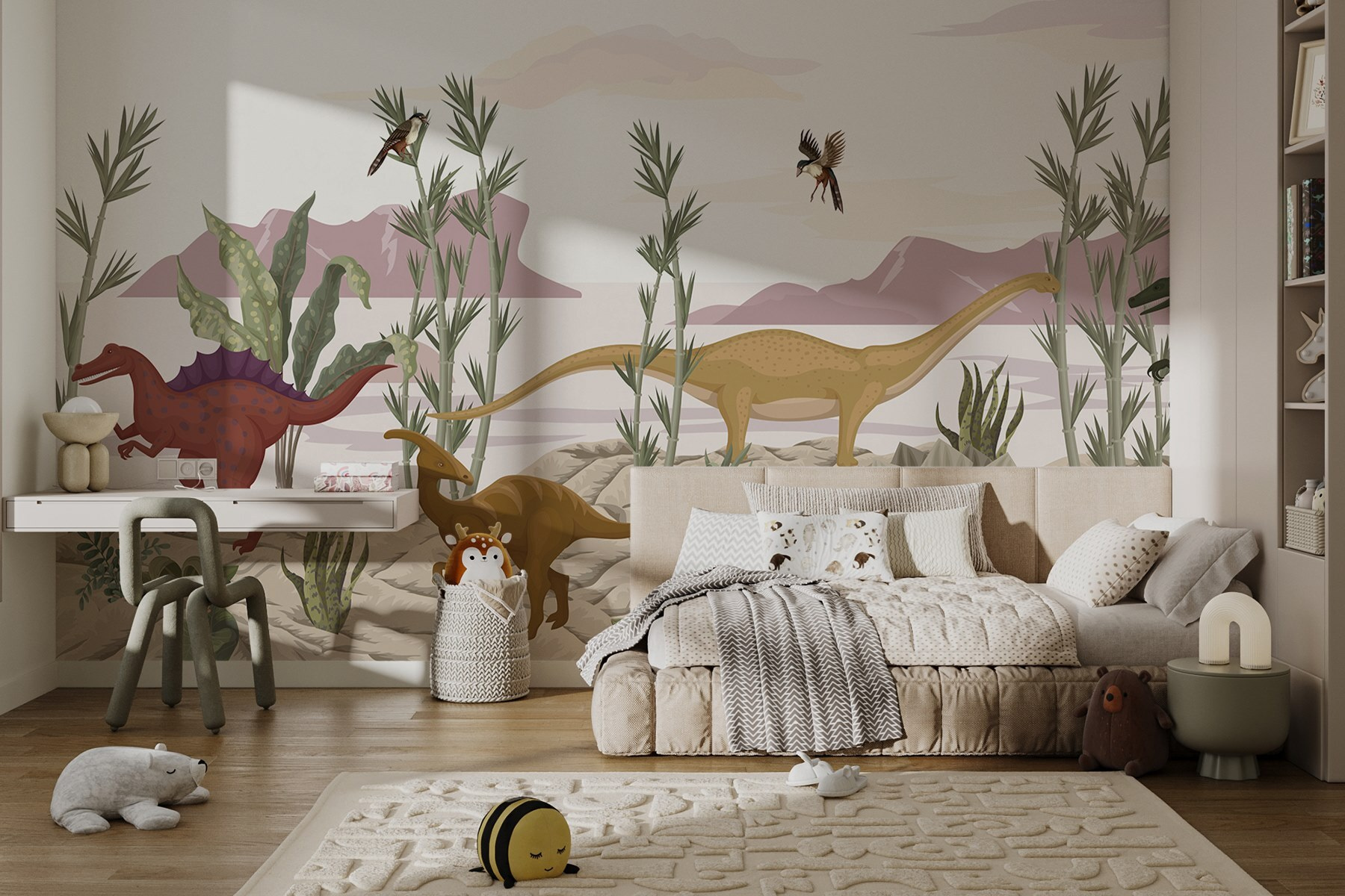 Transformez n’importe quel espace avec cette peinture murale vibrante représentant un groupe animé de dinosaures explorant un paysage désertique. Imaginez que vous entrez dans une pièce où des géants sympathiques comme le gentil Brachiosaure et le curieux Stégosaure semblent prendre vie sur vos murs. Les tons doux de la terre et la verdure ludique créent une ambiance à la fois calme et excitante. C’est le sujet de conversation idéal : les enfants seront ravis de montrer leurs préférées tout en rêvant secrètement d’aventures préhistoriques. Que ce soit dans une salle de jeux ou dans un coin douillet, cette peinture murale vous transporte dans un monde où les dinosaures prospèrent. Qui ne voudrait pas d’un peu de magie dino dans son espace ?
