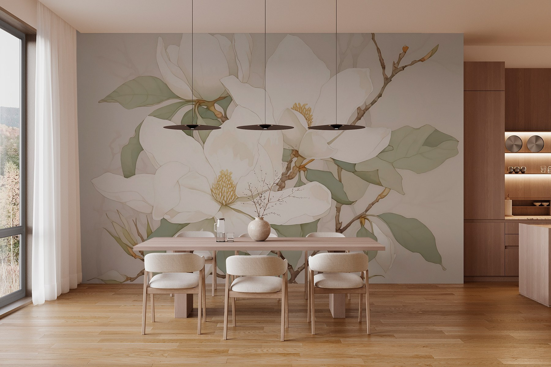Transformez n’importe quelle pièce avec cette superbe peinture murale de fleurs blanches. Imaginez que vous entrez dans votre espace et que vous êtes accueilli par des fleurs douces et sereines qui semblent presque chuchoter la tranquillité. Les pétales délicats et les verts doux créent une atmosphère à la fois rafraîchissante et apaisante, parfaite pour un coin lecture confortable ou une chambre à coucher calme.