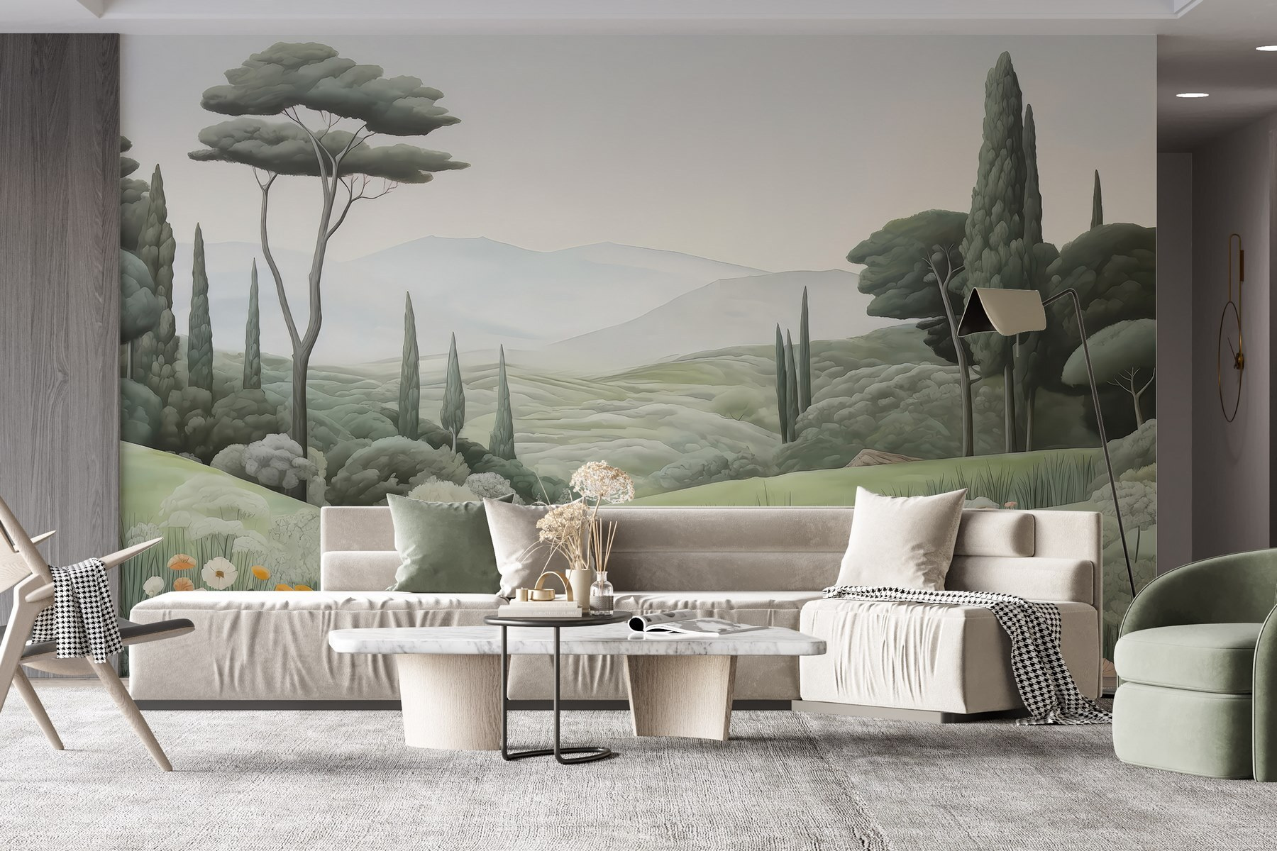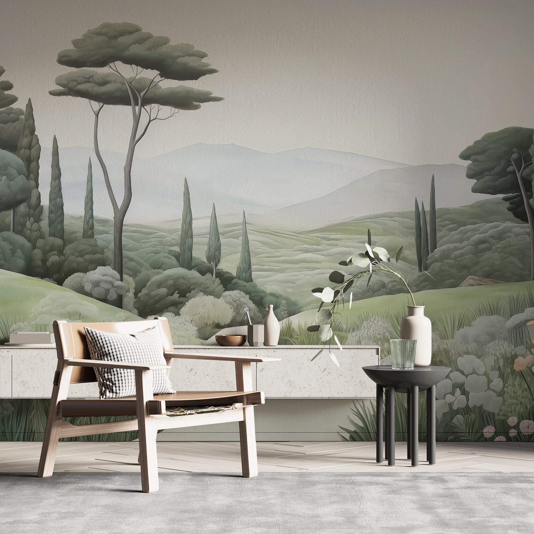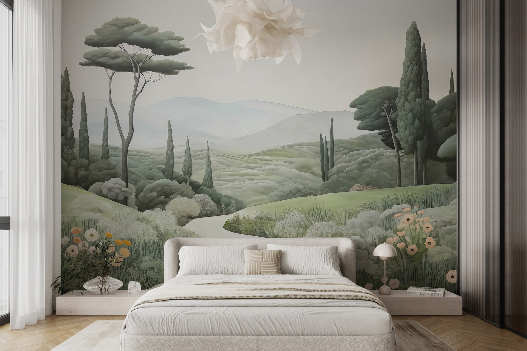 Transformez votre espace avec cette peinture murale enchanteresse représentant un paysage serein, avec un chemin sinueux et des arbres gracieux. Imaginez que vous entrez dans un endroit paisible à chaque fois que vous pénétrez dans la pièce. Les douces nuances de vert et les murmures de la nature invitent au calme, ce qui est parfait pour les soirées douillettes où il est essentiel de se détendre.
