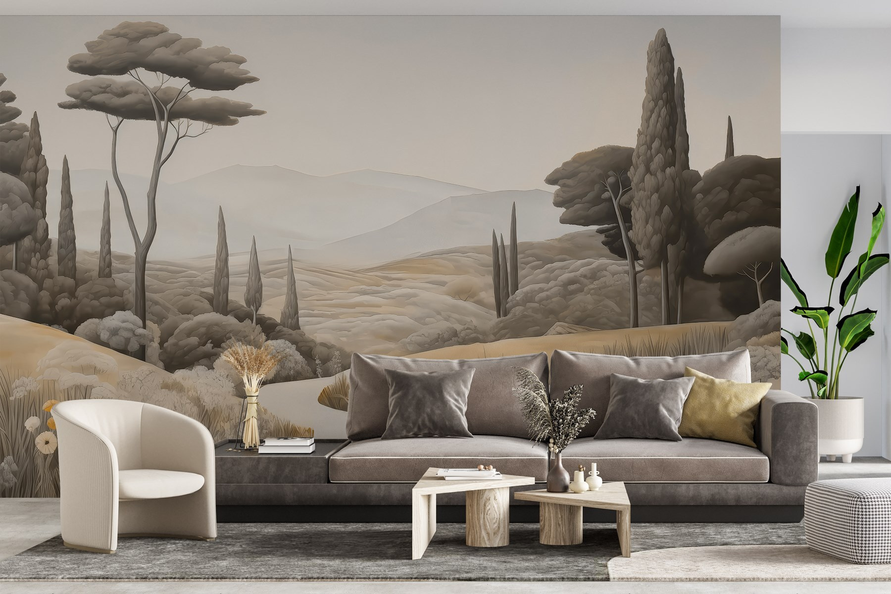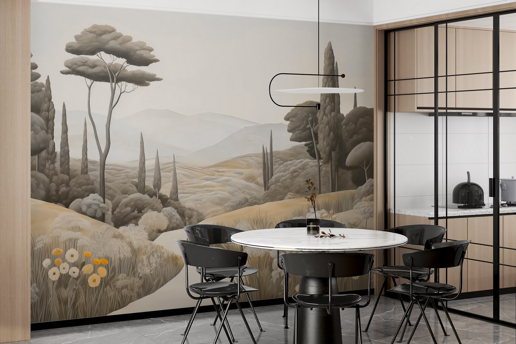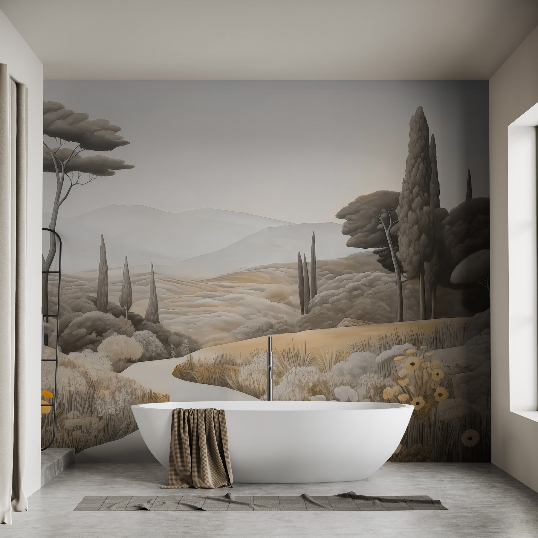 Transformez votre espace avec cette superbe peinture murale, “Paysage avec une route sinueuse et des arbres”. Il donne vie à une campagne sereine, invitant la nature à l’intérieur sans le désordre de l’extérieur. Imaginez que vous sirotiez un café lors d’un dimanche paresseux en contemplant de douces collines et des arbres qui se balancent – c’est comme des mini-vacances sur votre mur. Parfaite pour ces moments de rêve, cette peinture murale enveloppe votre pièce de tons chauds et terreux et de détails doux qui vous donnent envie de respirer profondément. Elle évoque la détente, vous rappelant les promenades paisibles sous un ciel ouvert. Imaginez les conversations qu’elle pourrait susciter ou les ondes calmes qu’elle apporte – quelle touche de douceur pour n’importe quel coin !