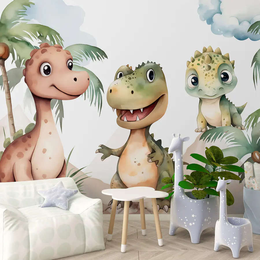 Apportez une touche de fantaisie à n’importe quelle pièce avec cette charmante peinture murale d’adorables dinosaures debout sur des rochers. Imaginez que vous entrez dans un espace où des dinosaures joyeux vous accueillent avec de grands sourires amicaux – difficile de ne pas se sentir un peu plus léger, n’est-ce pas ? Ces adorables visages sont parfaits pour susciter la joie et la nostalgie, que ce soit pour vous ou pour les tout-petits qui courent autour.