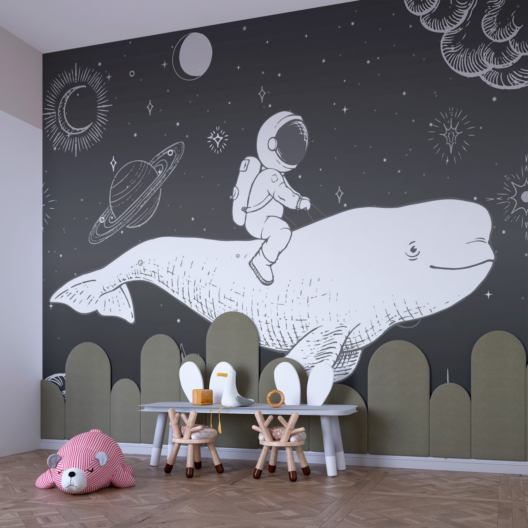 Transformez n’importe quel espace avec cette peinture murale fantaisiste représentant un astronaute aventureux chevauchant une baleine dans un pays des merveilles cosmiques. Imaginez : un salon serein ou une aire de jeu pour enfants devient un portail vers l’imagination, suscitant la joie à chaque fois que quelqu’un y entre. Le mélange ludique de la vie marine et du ciel étoilé invite à la rêverie, comme s’il s’agissait d’une conversation secrète entre la mer et les étoiles. Il ne s’agit pas seulement d’un décor, mais d’un rappel quotidien à l’exploration de ce qui n’est pas conventionnel. Alors, allez-y, ajoutez une touche d’émerveillement à vos murs et laissez voguer votre imagination !