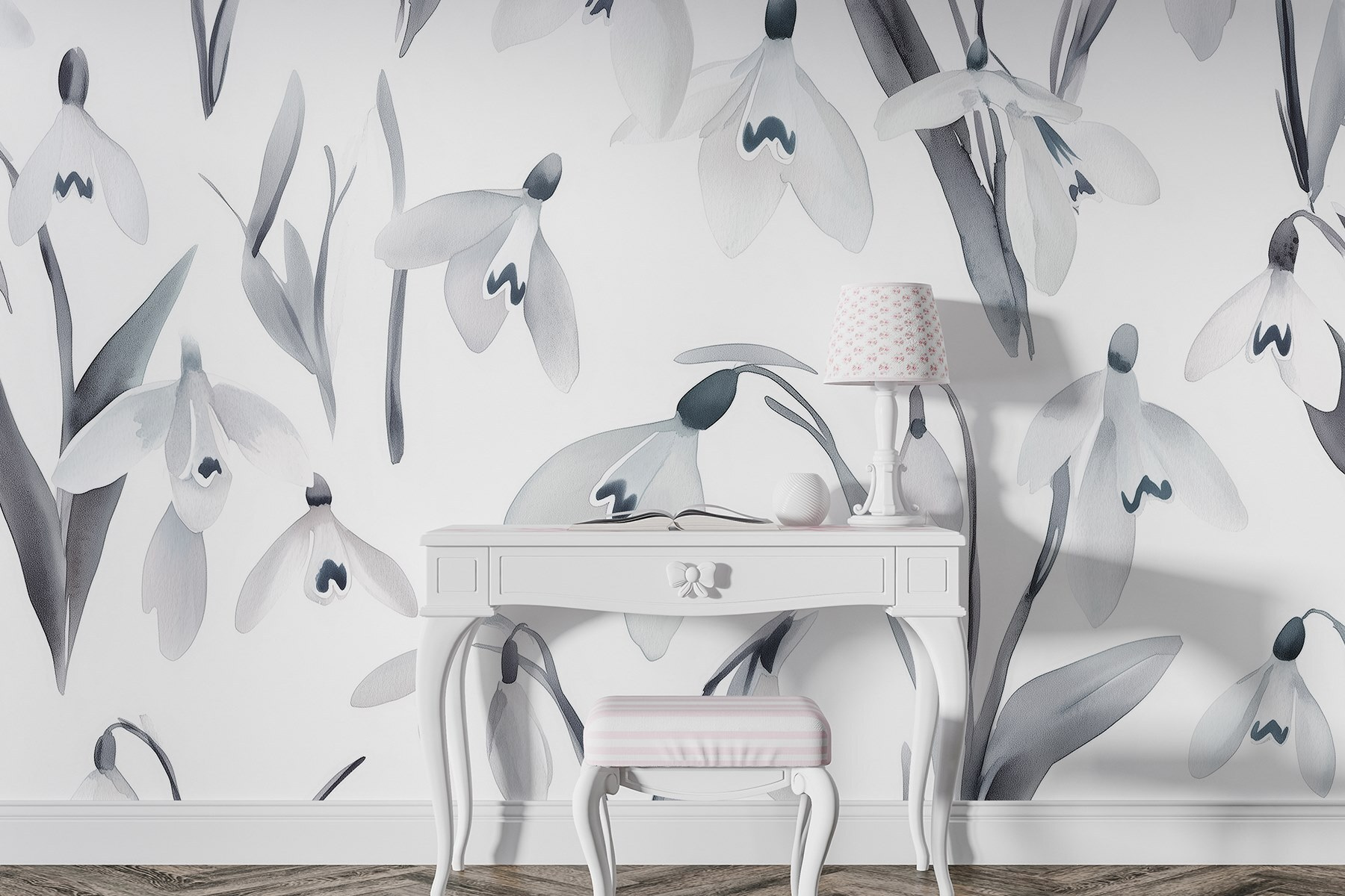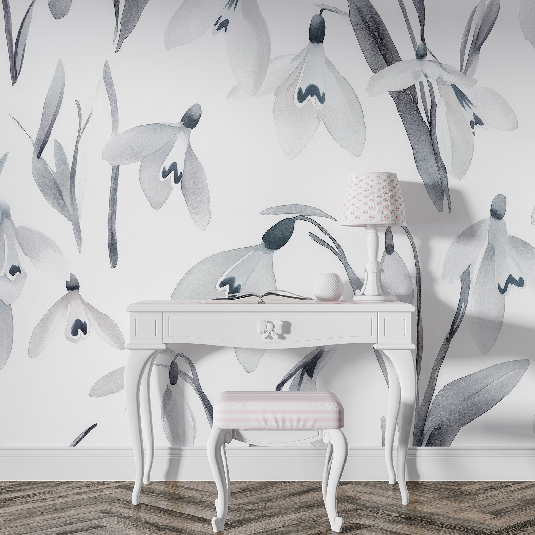 Transformez n’importe quelle pièce avec le charme des “Muraux Fleurs blanches avec feuilles grises”. Cette peinture murale apporte une ambiance douce et naturelle, rappelant un jardin serein par une journée de printemps, sans les éternuements dus aux allergies. Elle est parfaite pour les moments où vous avez envie de vous détendre avec une tasse de thé et de vous perdre dans les couches de fleurs délicates. Imaginez que vous vous réveillez dans ce décor de rêve – c’est comme si vous aviez un petit coin de nature chez vous. Les teintes douces créent une toile de fond apaisante, donnant aux espaces une impression de légèreté et d’ouverture. Que ce soit dans un coin douillet ou dans un salon spacieux, cette peinture murale s’impose sans effort, invitant tranquillement à la chaleur et à la sérénité. Qui pourrait dire non à des fleurs qui se reflètent sur le mur ?