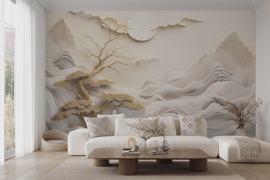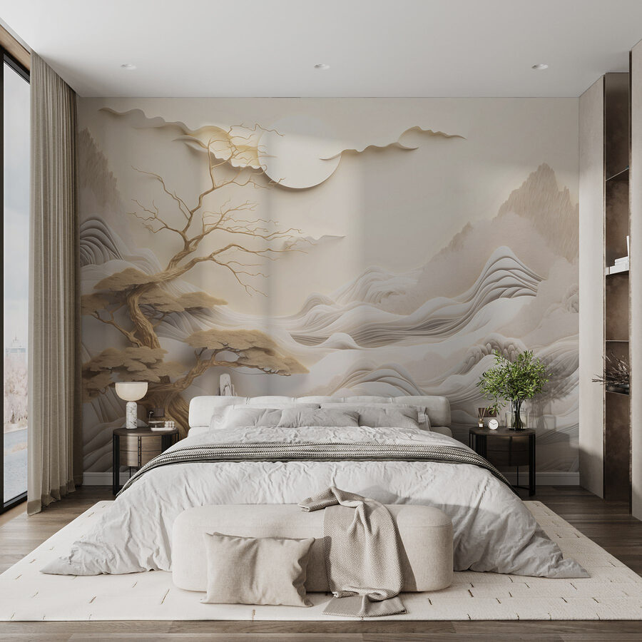 Transformez n’importe quelle pièce en un lieu d’évasion tranquille grâce à cette superbe peinture murale représentant un arbre, des montagnes, des nuages et un grand soleil. C’est comme si vous pouviez profiter d’une vue sereine sur les montagnes à l’intérieur, sans avoir à faire une randonnée. Imaginez-vous en train de siroter un café tout en profitant de la douce lueur du soleil à travers les montagnes. Parfait pour un salon ou un coin lecture confortable, il suscite la conversation et amène les invités à réfléchir aux mystères de la vie. De plus, les tons sourds créent une ambiance calme qui facilite la détente. Qui ne voudrait pas d’un peu d’étreinte de la nature ? Honnêtement, cette peinture murale est la meilleure toile de fond pour les dimanches paresseux ou les soirées dansantes spontanées.