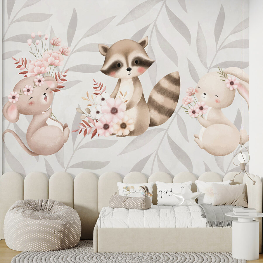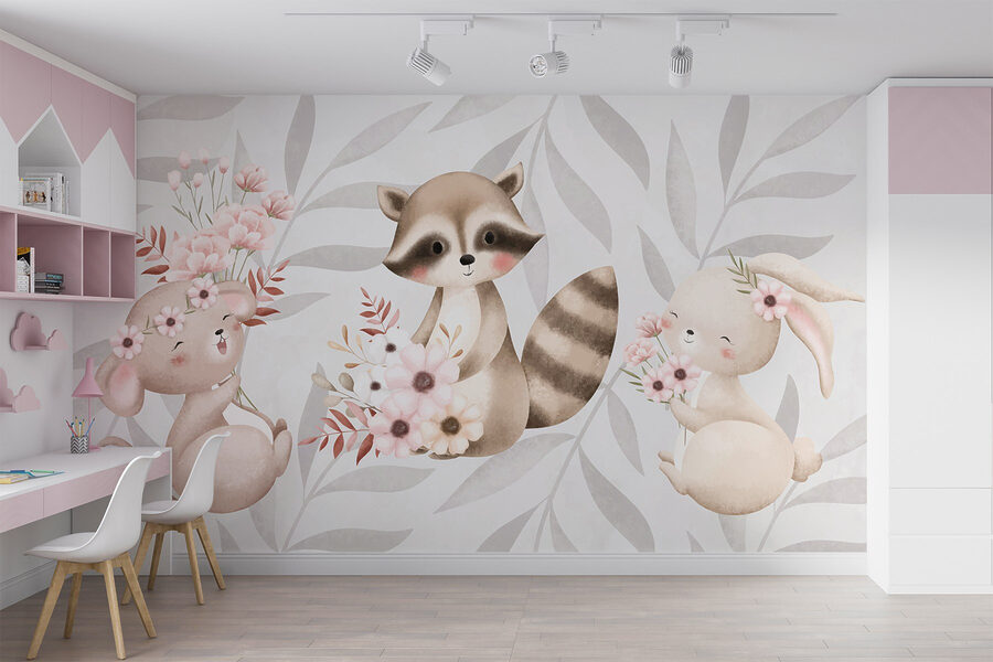 Transformez un mur terne en un havre de paix fantaisiste grâce à cette ravissante peinture murale représentant un raton laveur et un lapin, chacun tenant un bouquet de fleurs. C’est comme si vous faisiez entrer une petite tranche de nature dans votre maison, où ces charmantes bestioles semblent prendre vie sous vos yeux. Imaginez que vous entrez dans une pièce et que vos invités vous sourient instantanément. Les tons neutres et les graphismes doux créent une ambiance chaleureuse, parfaite pour les chambres d’enfants, les salles de jeux ou même le coin lecture que vous avez toujours l’intention de réaménager. Chaque coup d’œil à ces adorables animaux peut susciter un peu de joie, vous rappelant que la vie est parfois faite de petites choses, comme les fleurs et les amis à fourrure. C’est un sujet de conversation, une touche de gaieté et, honnêtement, qui pourrait résister à ces jolis visages ?