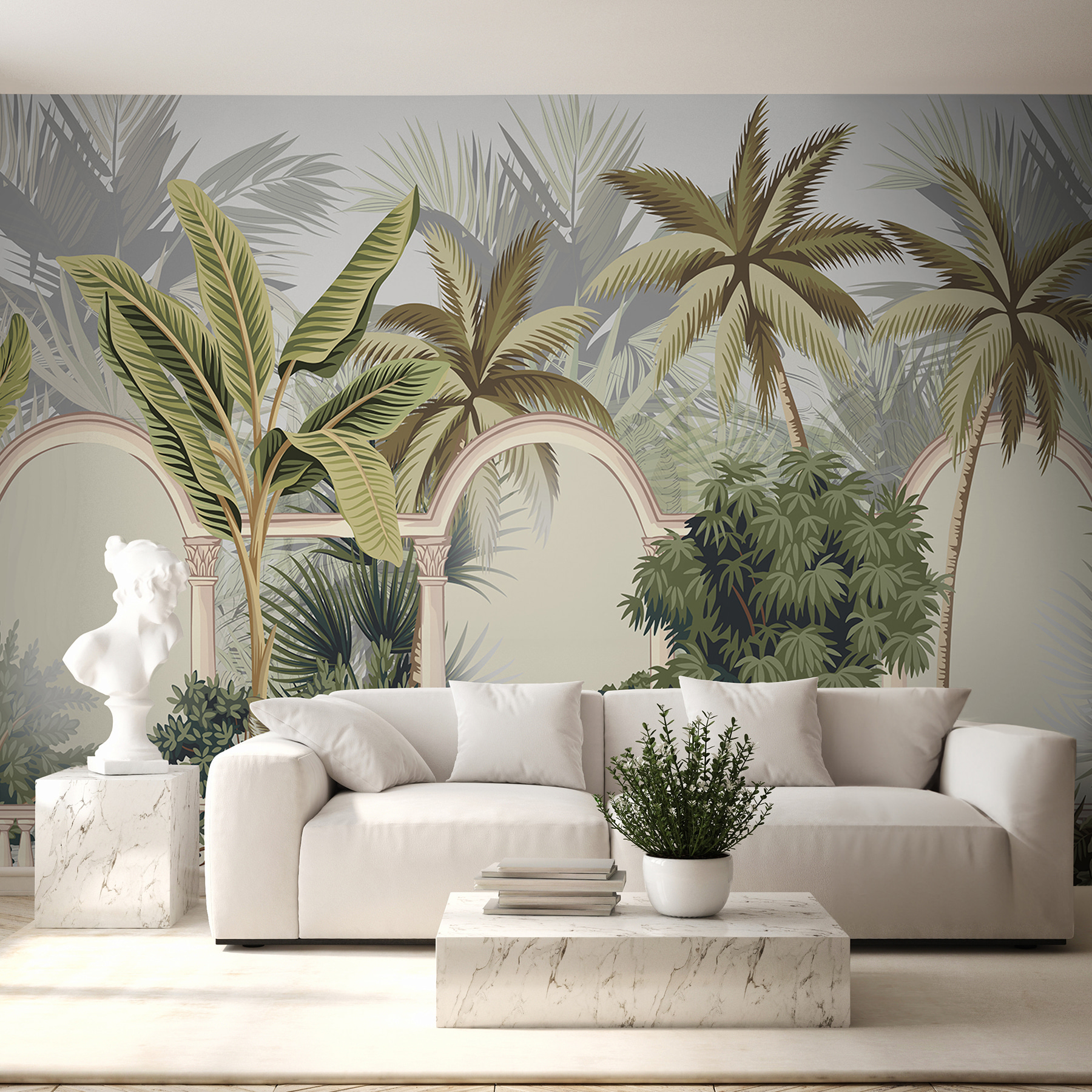 Imaginez que vous entrez dans votre chambre et que vous avez l’impression d’avoir pénétré dans une oasis tropicale sereine. Cette peinture murale, avec ses palmiers gracieux se balançant doucement contre d’élégantes arches, crée cette ambiance sans effort. C’est comme une petite évasion, une fenêtre sur une jungle luxuriante sans quitter la maison. Parfait pour ajouter une touche de nature et un soupçon d’aventure à votre espace. Qui aurait cru qu’un mur pouvait être votre billet pour le paradis ? Ajoutez-y des sièges confortables et vous vous retrouverez peut-être à rêvasser à la brise des îles.