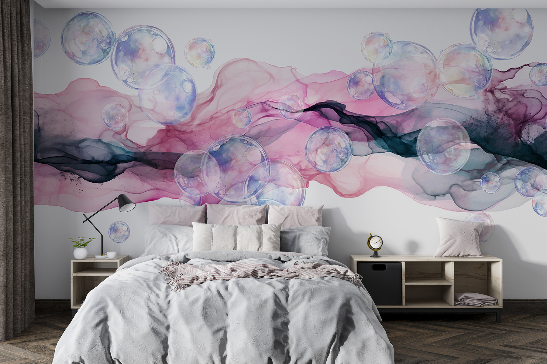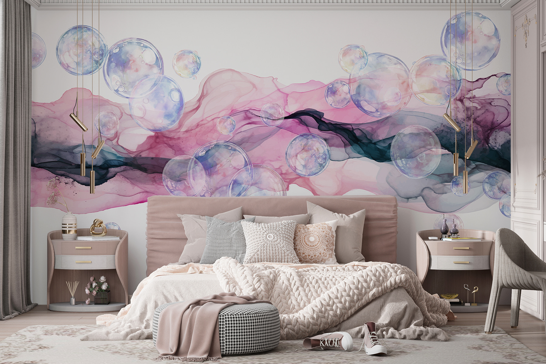 Imaginez un rêve éveillé rendu tangible : cette peinture murale est une pure magie. Ces bulles, comme de doux murmures, flottent dans une danse enchanteresse de roses et de violets. Vous avez déjà eu l’impression de pénétrer dans une aquarelle ? C’est l’occasion ou jamais. Votre chambre peut devenir une oasis de calme ou un univers fantaisiste où la créativité s’exprime. Sentez la sérénité vous envahir lorsque la lumière touche ces teintes délicates, jetant de doux reflets. Parfait pour tous ceux qui croient en la beauté de l’imagination – et qui n’a pas besoin d’un peu plus de fantaisie dans sa vie ?
